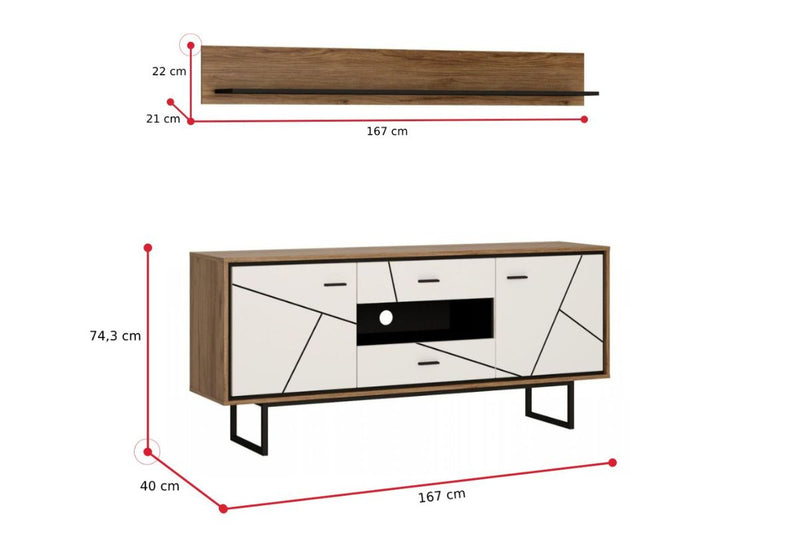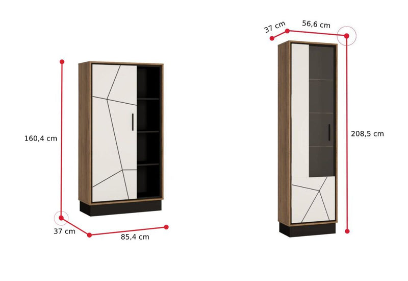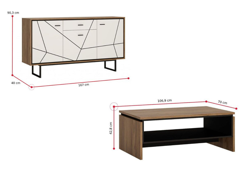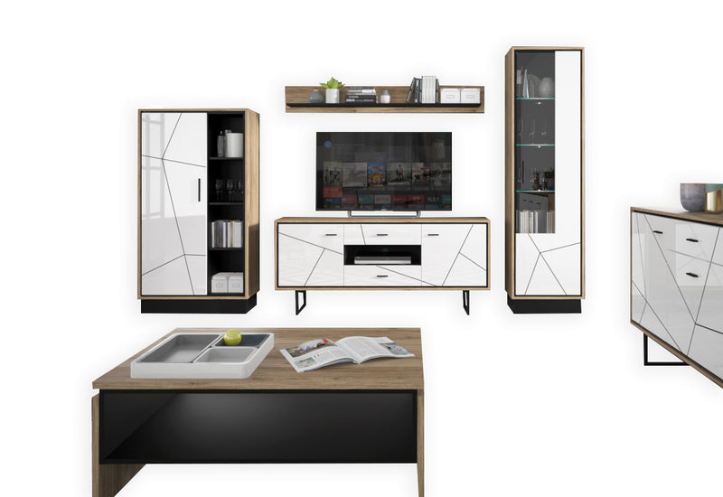 Obývacia zostava BRONO. Obývacia zostava Vás zaujme jednoduchými modernými líniami. Je vyrobená z kvalitného materiálu. Skladá sa z TV stolíka, konferenčného stolíka, komody, police a dvoch vitrín. Vyššiu vitrínu je možné zakúpiť v ľavej či pravej orientácii. Zakúpiť môžete spolu s ďalšími produktmi z radu BRONO.