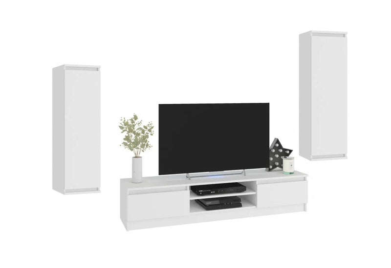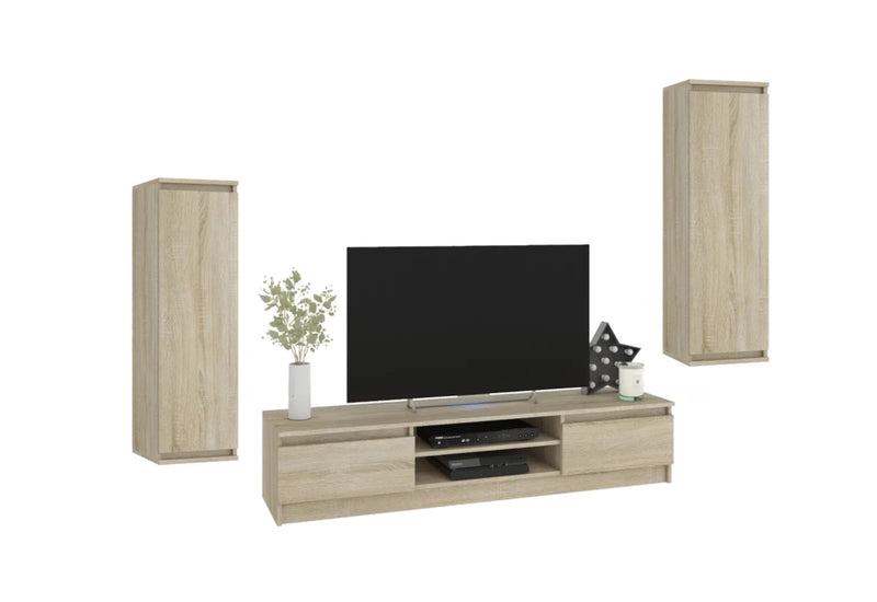 Obývacia zostava CELTA. Zaujme vás jednoduchými líniami modernej obývacej zostavy. Na ochranu obývacej zostavy pred poškodením a vlhkosťou bol použitý kvalitný materiál s hrúbkou 1,6 cm s hranami ABS. Dvierka sú bez úchytu. Obývacia stena obsahuje dve závesné skrinky a TV stolík.