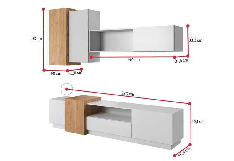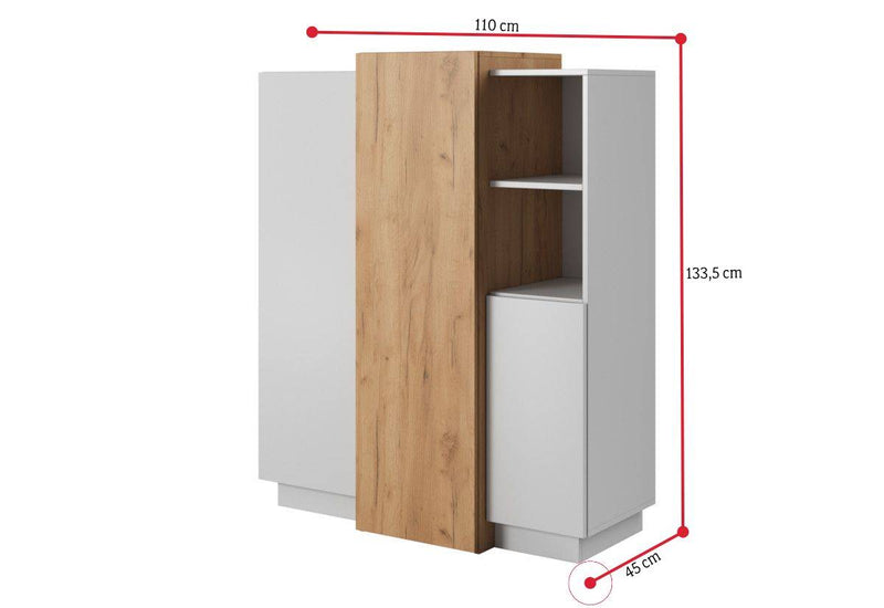 Obývacia zostava LAMU. Vyrobená je z kvalitného materiálu a vybavená ABS hranou. Tá chráni pred mechanickým poškodením a vlhkosťou. Skladá sa z vysokej komody, závesnej skrinky a police, komody, konferenčného a TV stolíka. Dvierka a zásuvky nemajú úchytky, otvárajú sa pomocou systému PUSH TO OPEN. Produkty je možné zakúpiť aj jednotlivo, čím si môžete obývaciu zostavu poskladať podľa svojho uváženia.