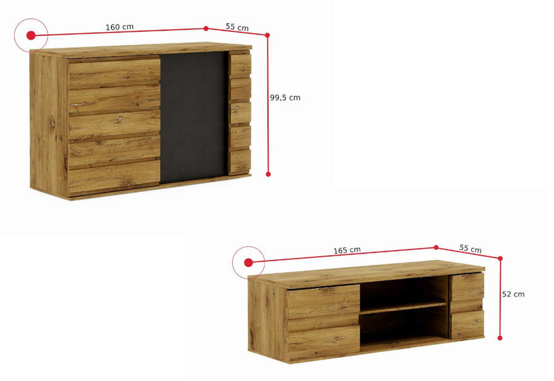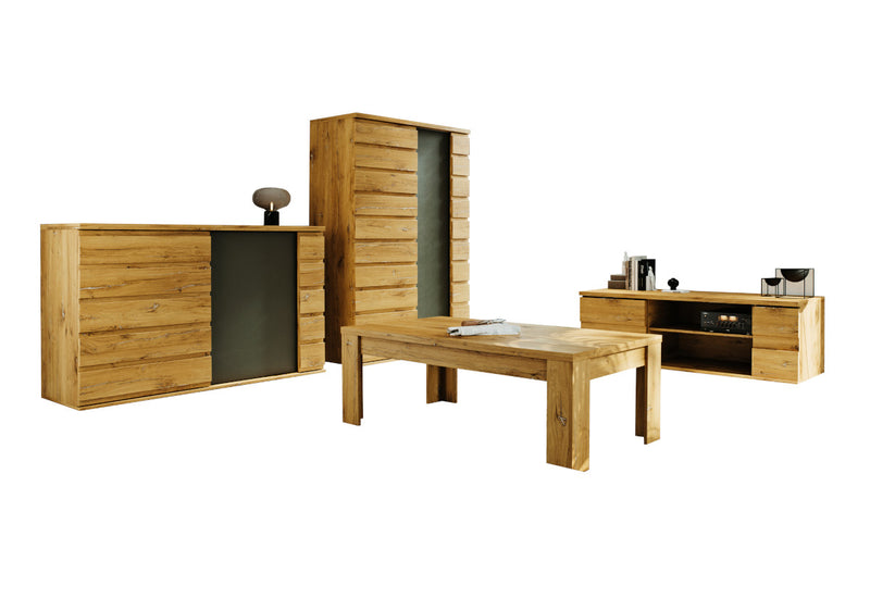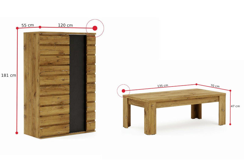 Obývacia zostava MIROLA. Zaujme moderným dizajnom a kvalitným spracovaním. Je vyrobený z kvalitného materiálu a opatrený ABS hranami, ktoré chránia pred mechanickým poškodením a vlhkosťou. Poskytuje dostatok úložného priestoru. Skladá sa z vysokej skrine, komody, TV stolíka a konferenčného stolíka. Kombinovať môžete s ďalšími produktmi z radu MIROLA.