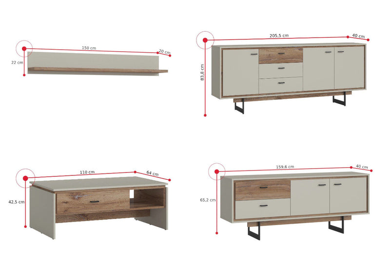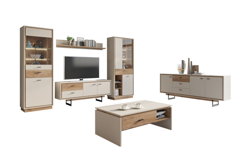 Obývacia zostava RIVAL. Zaujme Vás jednoduchými líniami modernej obývacej zostavy. Vyrobená je z kvalitného materiálu, ktorý je opatrený ABS hranami. Chráni tak materiál pred mechanickým poškodením a vlhkosťou. Obývacia zostava sa skladá z dvoch vyšších vitrín, komody, police, konferenčného a TV stolíka. Komoda a TV stolík stoja na vyšších kovových nožičkách. Dvierka a zásuvky pri zostave sú vybavené kovovými čiernymi úchytmi pre praktické otváranie.