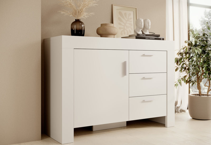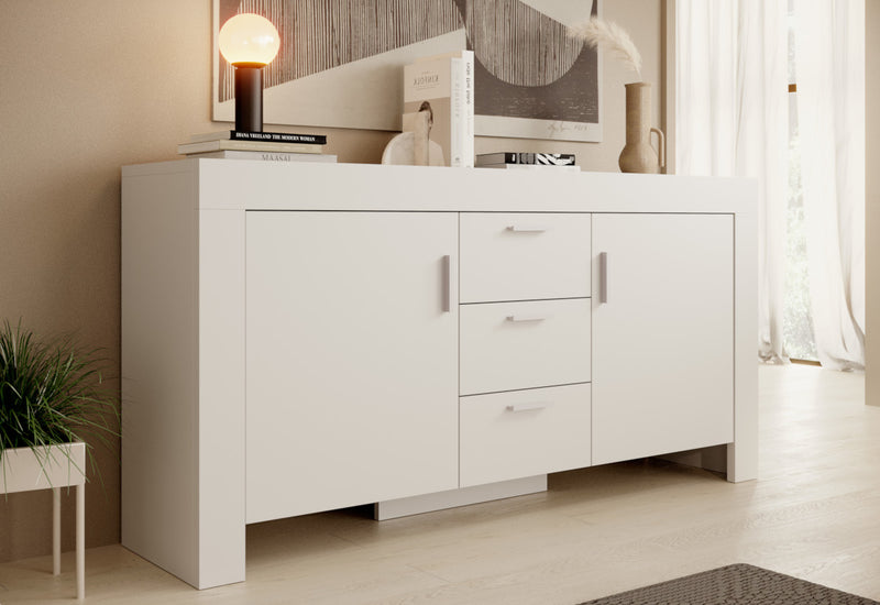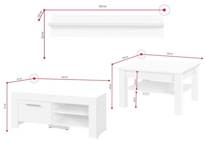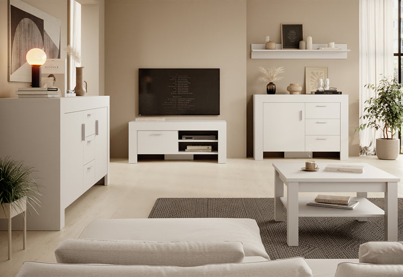 Obývacia zostava SIRO. Zaujme Vás jednoduchými líniami. Vyrobená je z kvalitného materiálu s hrúbkou 1,6 cm. Zostava sa skladá z dvoch komôd, závesnej police, konferenčného a TV stolíka. Opatrená je úchytmi pre ľahšiu manipuláciu.