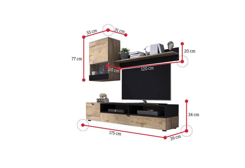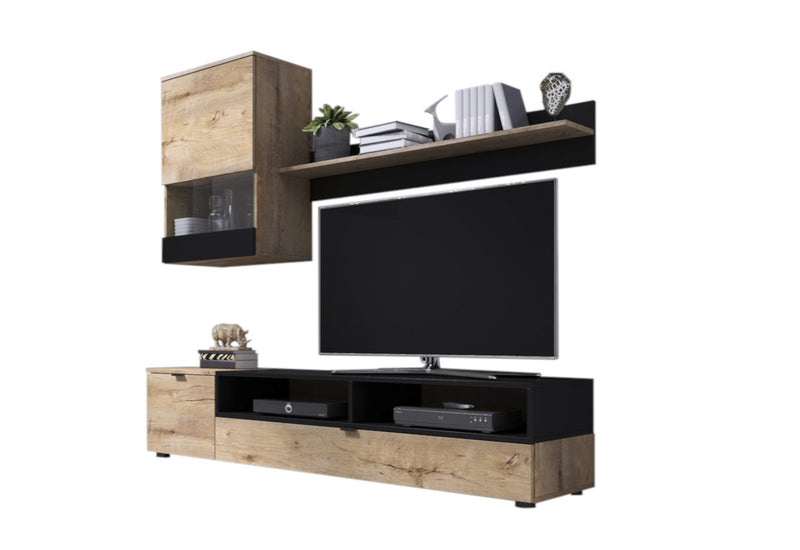 Obývacia zostava XENA. Zaujme atraktívnym dekorom v modernom štýle. Súčasťou je závesná vitrína s poličkou, TV stolík a závesná polica. TV stolík je rozdelený na dve otvorené police a dva úložné priestory za dvierkami s úchytmi. Zostava je vyrobená z kvalitného materiálu a môžete si vybrať z viacerých dekorov.