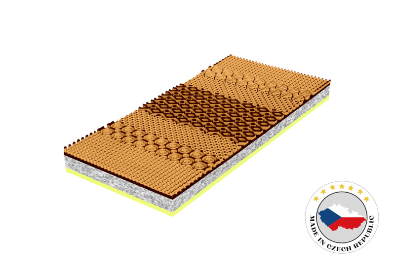 Penový matrac KRETA. Matrac s 3D Rainbow technológiou. Patrí medzi penové, obojstranné matrace s tvrdou a stredne tvrdou stranou. Strana FLEXI RELAX má 7-zónovú masážnu profiláciu na uvoľnenie svalstva. Vyrobená je technológiou 3D Rainbow, ktorá dokáže kombinovať materiály rôznych vlastností, kde vzdušná a pružná pena sú dohromady a tým tak poskytuje zvýšený odvod potu pri zachovaní pružnosti a tuhosti. Strana FLEXI KLASIK je vyrobená z pružnej peny Flexifoam bez profilácie. Stredná časť jadra je vyrobená z eko peny Flexifoam Rekogreen, prevedenie šetrné k prírode. Povrch matraca je chránený poťahom, ktorý je prešívaný klimatizačnými vrstvami dutých vlákien, dvojdielna konštrukcia. Poťah je vyrobený z kvalitného polyesteru, s povrchovým ošetrením vlákien pomocou nanokapsúl v úprave Bamboo, ktoré sa blahodárne starajú o pokožku a umožňujú odvod vlhkosti z matraca von. Príjemný na dotyk, opatrený zipsom. Vhodný aj pre alergikov.