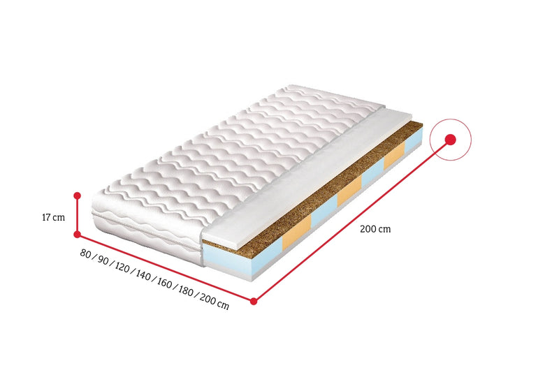 Penový matrac LUIZA je obojstranne použiteľný. Z jednej strany je stredne tvrdý - H3, z druhej tvrdý - H4. Telo matraca tvorí kvalitná polyuretánová pena T25, ktorá je flexibilná a hypoalergénna. Výborne sa tak prispôsobí telu a maximálne eliminuje riziko alergickej reakcie a usadzovaniu roztočov. Povrch matraca je chránený na zips uzatvárateľným a ľahko snímateľným prešívaným poťahom, ktorý je veľmi príjemný na dotyk. Výška je cca 17 cm vrátane poťahu.