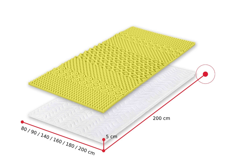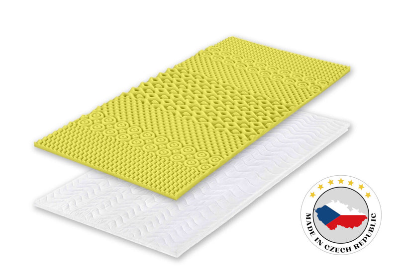 Penový topper FANY. Topper je skvelý na vylepšenie vlastností používaného matraca. Pokiaľ vám napríklad nevyhovuje tvrdosť, výška alebo ak si chcete zlepšiť hygienu v lôžku, tak obstaraním toppera môžete tieto vlastnosti zlepšiť. Vrchný krycí matrac z peny Flexifoam za studena tvárnenej strednej tuhosti s gumovými pásikmi pre jednoduché uchytenie aj k vysokým matracom. Snímateľný poťah MicroClimax je prešívaný klimatizačnými vrstvami kvalitného dutého vlákna na zips a prateľný na 95 °C. Topper je 5 cm vysoký vrátane poťahu.