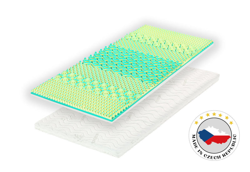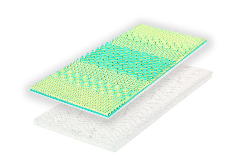 Penový topper REX. Topper je skvelý na vylepšenie vlastností používaného matraca napríklad ak vám nevyhovuje tvrdosť, výška alebo ak chcete zlepšiť hygienu v lôžku. Luxusný topper s 3D Rainbow technológiou. Žlto-zelená strana Visco relax je zložená z dvoch rôzne tuhých pien Visc a pružnej za studena tvárnenej peny Flexifoam bez prístupu vzduchu pre stálosť mechanických vlastností s vysokou vzdušnosťou. Druhá strana toppera je tvorená vzdušnou penou. Snímateľný poťah na zips BAMBOO je prešívaný klimatizačnými vrstvami dutých vlákien, prateľný na 60 °C. Topper je 9 cm vysoký vrátane poťahu.