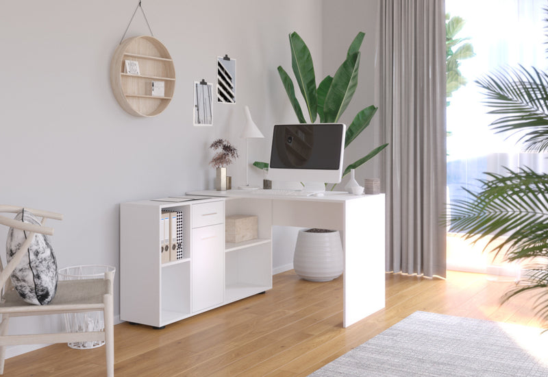 Písací stôl ELISEA. Je vyrobený z kvalitného materiálu s hrúbkou 1,6 cm. Pevná konštrukcia z kvalitnej dosky zaistí stabilitu a odolnosť proti poškodeniu. Stolík poskytuje dostatok úložného priestoru v podobe jednej zásuvky, skrinky a štyroch poličiek. Na výber z niekoľkých dekorov. Orientácia rohu je univerzálna.