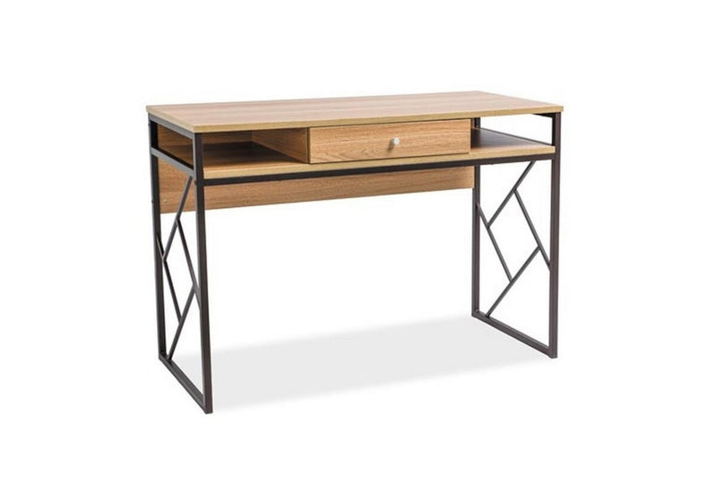 Písací stôl FOLHA B očarí každého milovníka industriálneho štýlu. Vyrobený je z kombinácie kvalitného materiálu v dubovom dekore a tmavo hnedého kovu. Úložný priestor pod hornou doskou je rozdelený do jednej zásuvky a dvoch odkrytých poličiek.
