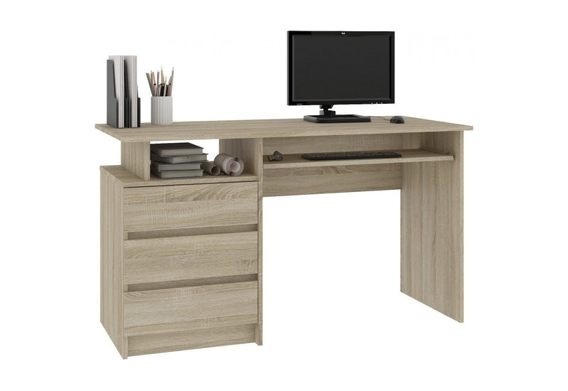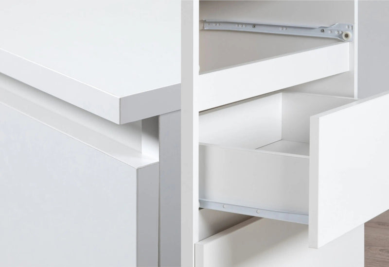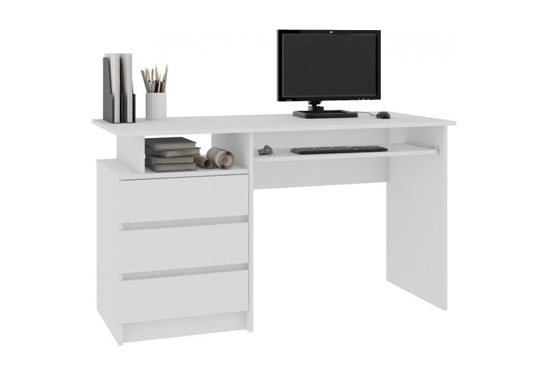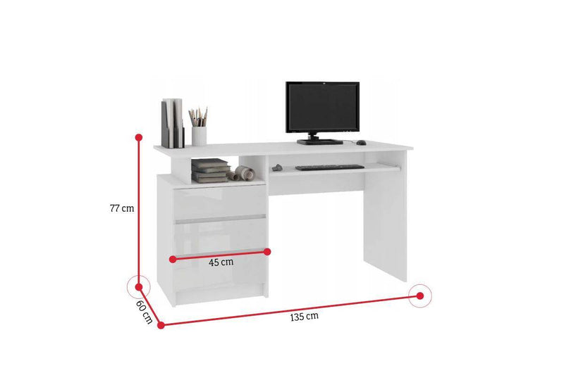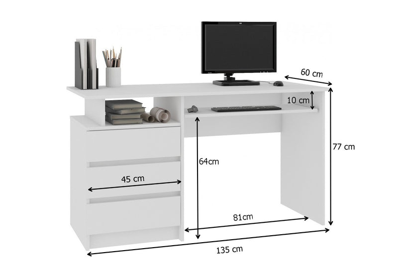 Písací stôl KORDA CLP 135 je vyrobený z veľmi kvalitnej laminovanej dosky s hrúbkou 16 mm, ktorá má okraje chránené ABS hranou. Súčasťou stola sú 3 priestranné zásuvky a vysúvacia zásuvka na klávesnicu. Stôl je dostupný vo viacerých farebných prevedeniach a to vrátane lesklých. V lesklom prevedení sú vždy predné strany zásuviek. Ostatné časti sú v mate.