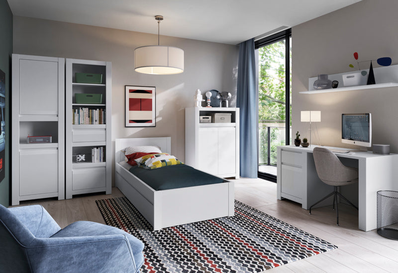 Písací stôl MANOL. Moderný písací stôl zaujme svojim jednoduchým dizajnom. Vyrobený je z kvalitných materiálov. Vytvára dostatok priestoru v podobe pracovnej plochy, zásuvky a skrinky s bezúchytovým systémom. Možnosť kombinovať s ďalšími produktmi z radu MANOL.