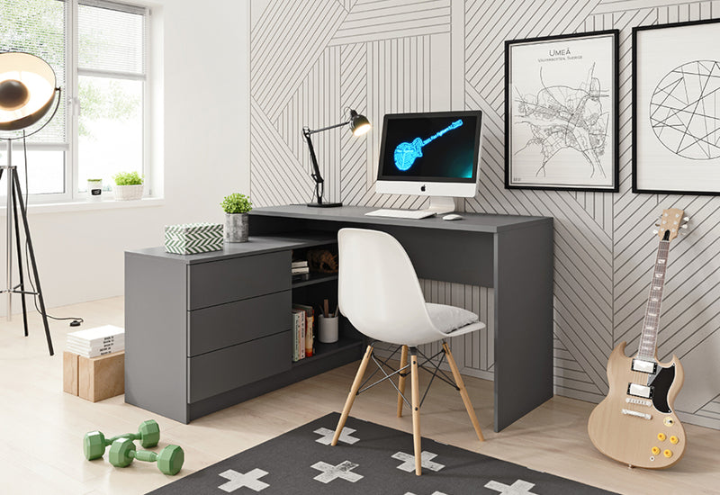 Písací stôl METI. Zaujme Vás jednoduchými líniami moderného štýlu. Je vyrobený z kvalitného materiálu, ktorý je opatrený ABS hranou. Tá chráni materiál pred mechanickým poškodením. Ako úložný priestor slúžia tri priestranné zásuvky a dve otvorené police. Hornú dosku môžete využiť ako odkladací priestor. Možnosť voľby dekoru.
