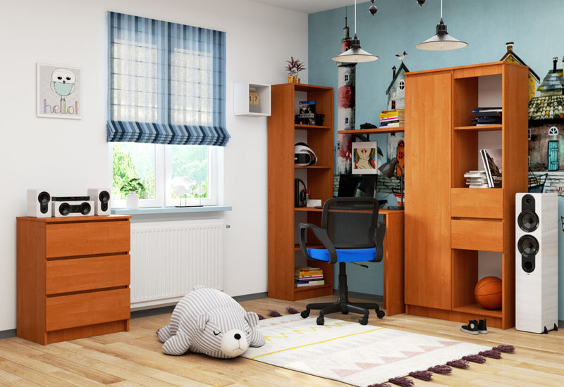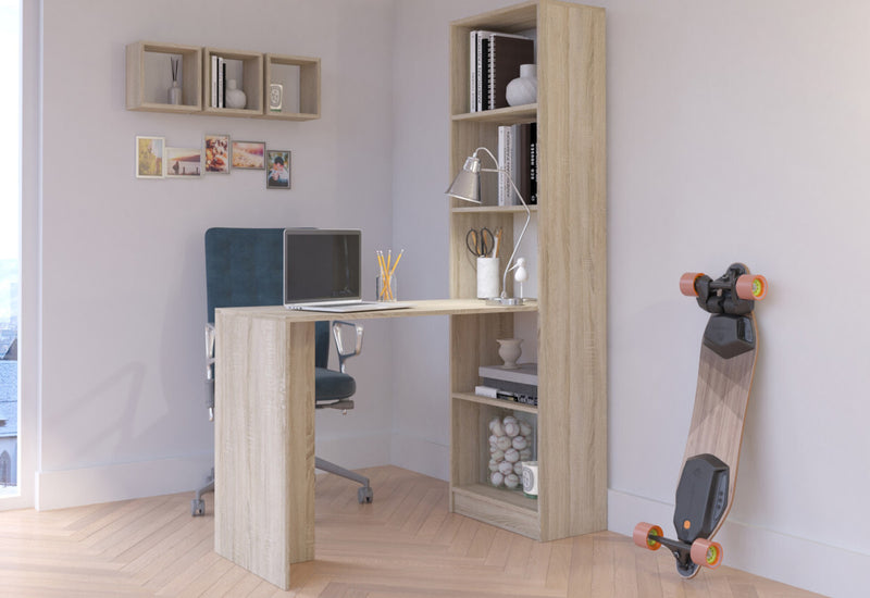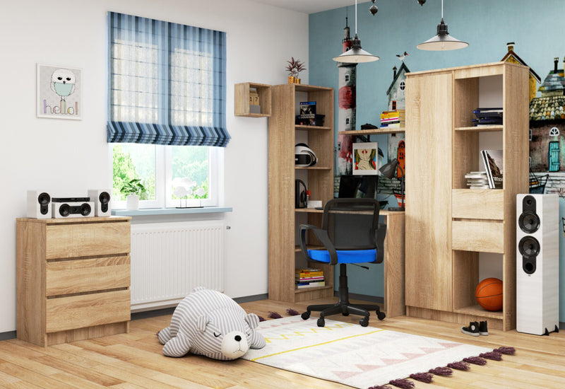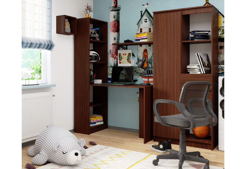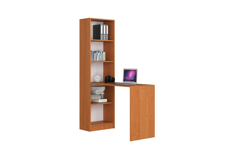 Písací stôl SATRA. Zaujme svojim praktickým a zároveň moderným dizajnom. Je vyrobený z kvalitného materiálu o hrúbke 1,6 cm. Opatrený je ABS hranou, ktorá chráni pred mechanickým poškodením. Súčasťou je vysoký regál so štyrmi otvorenými policami. Možnosť voľby z viacerých dekorov.