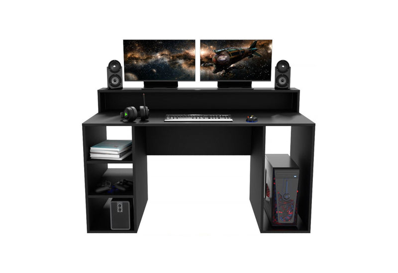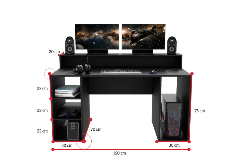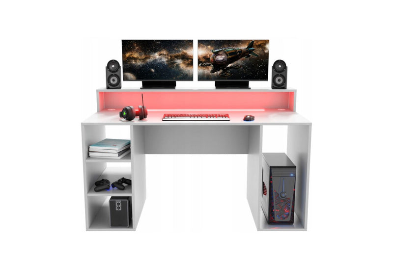 Počítačový herný stôl LENI. Je vyrobený z kvalitného materiálu s ABS hranami. Tie chránia materiál pred machanickým poškodením a vlhkosťou. Súčasťou stola sú dve káblové priechodky, ktoré sa nachádzajú pod vyvýšenou časťou stola. Bočné skrinky dodávajú stolu nielen stabilitu, ale aj množstvo úložného priestoru. Vyberať si môžete z viacerých farebných dekorov s možnosťou dokúpenia LED osvetlenia.