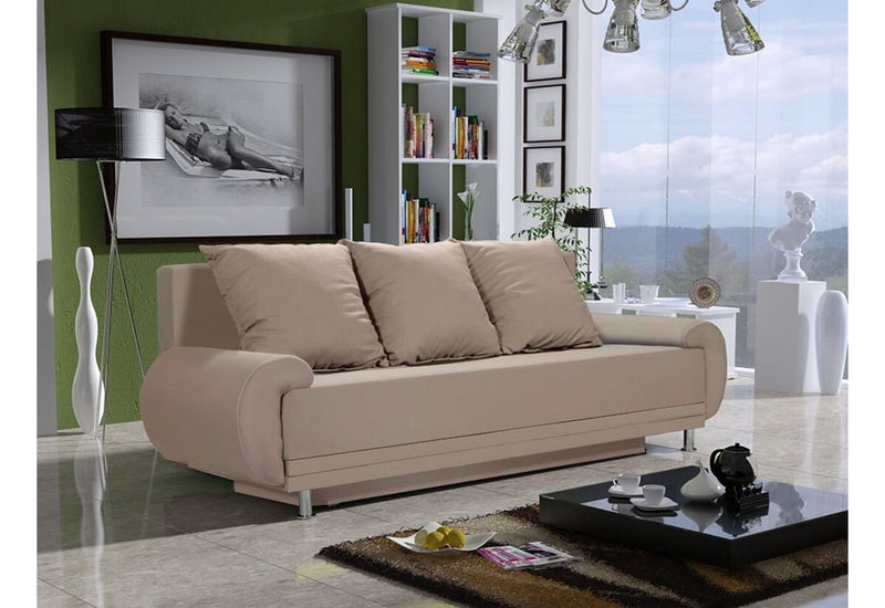 Pohovka AROMA. Je vyrobená z odolného materiálu a spolu s chrómovanými nožičkami tvorí stabilný základ. Sedacia plocha je z peny T2544. Na pohovke sa vám bude sedieť ako na obláčiku. Vďaka rozkladaciemu mechanizmu premeníte pohovku na lôžko kedykoľvek vám len napadne. Veľkou výhodou je tiež úložný priestor, ktorým pohovka disponuje.