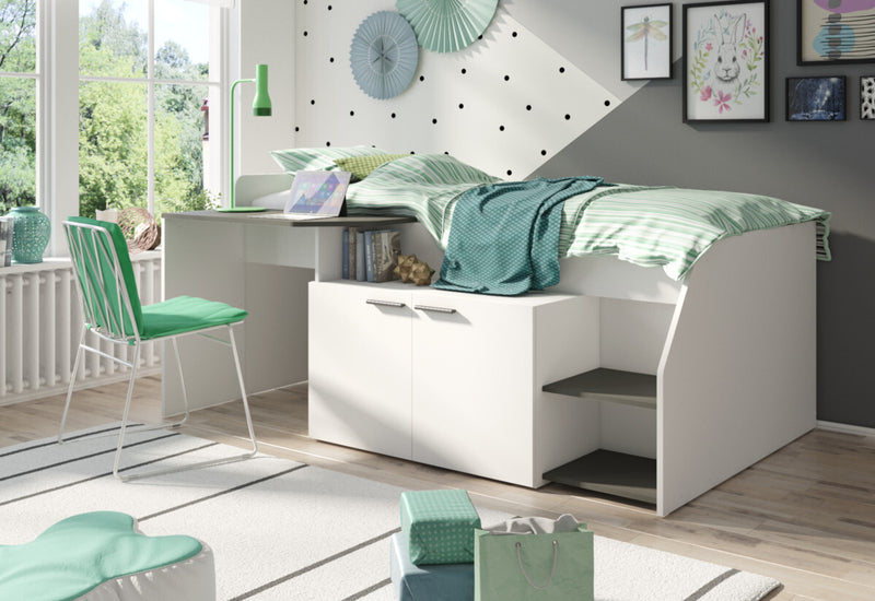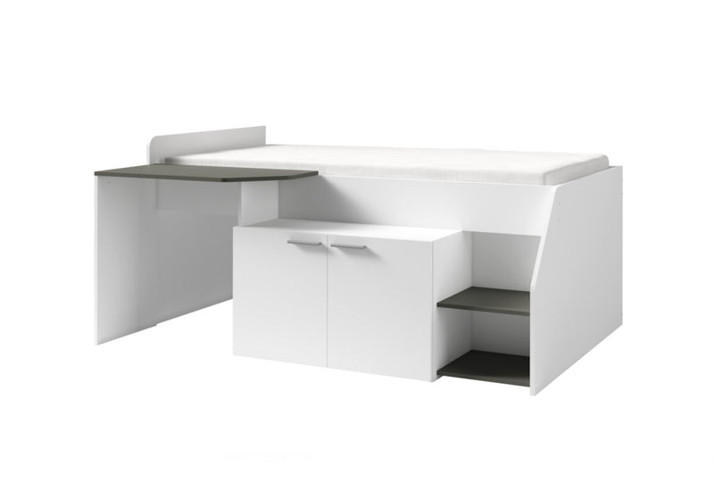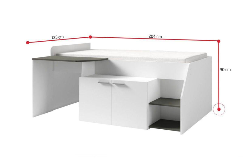 Posteľ MULTANA. Posteľ Vás zaujme jednoduchými líniami moderného štýlu. Je vyrobená z kvalitného materiálu, ktorý je opatrený ABS hranou. ABS hrana chráni materiál pred mechanickým poškodením. Pevná konštrukcia zaistí stabilitu a odolnosť proti poškodeniu. Súčasťou postele je písací stôl a skrinka. Vďaka svojmu vzhľadu nájde miesto v každom interiéri. Možnosť voľby matraca.