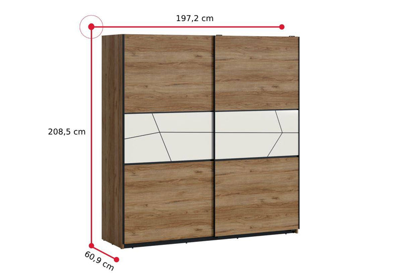 Posuvná šatníková skriňa BRONO. Šatníková skriňa Vás zaujme jednoduchými modernými líniami. Je vyrobená z kvalitného materiálu. Za posuvnými dverami sa ukrýva veľké množstvo úložného priestoru. Poskytne vám šesť priestranných políc na poskladané oblečenie a zároveň aj šatníkovú tyč. Zakúpiť môžete spolu s ďalšími produktmi z radu BRONO.