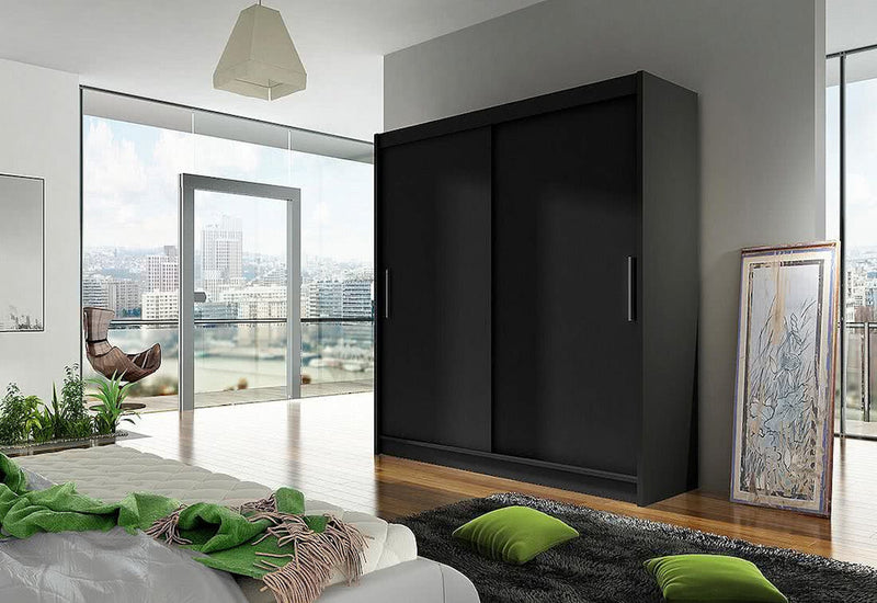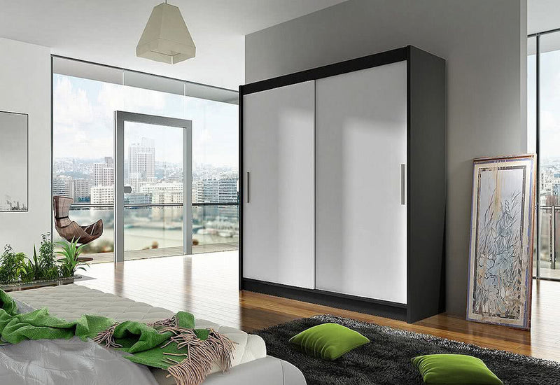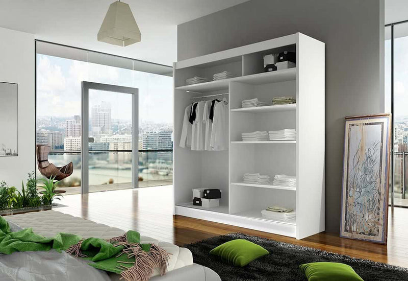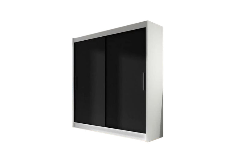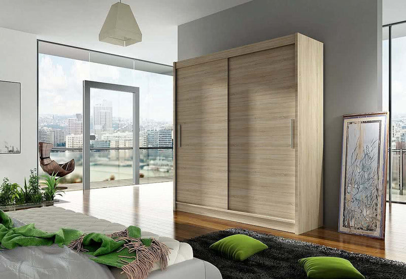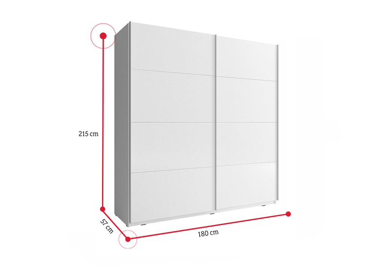 Posuvná šatníková skriňa CARLA I. Je vyrobená z vysokokvalitného materiálu s hrúbkou 1,6 cm. Za posuvnými dverami sa nachádza úložný priestor rozdelený na 5 políc a šatníkovú tyč. Na jednoduchšie otváranie sú dvere vybavené dlhou striebornou rukoväťou. Môžete si vybrať z viacerých dekorov.
