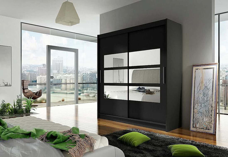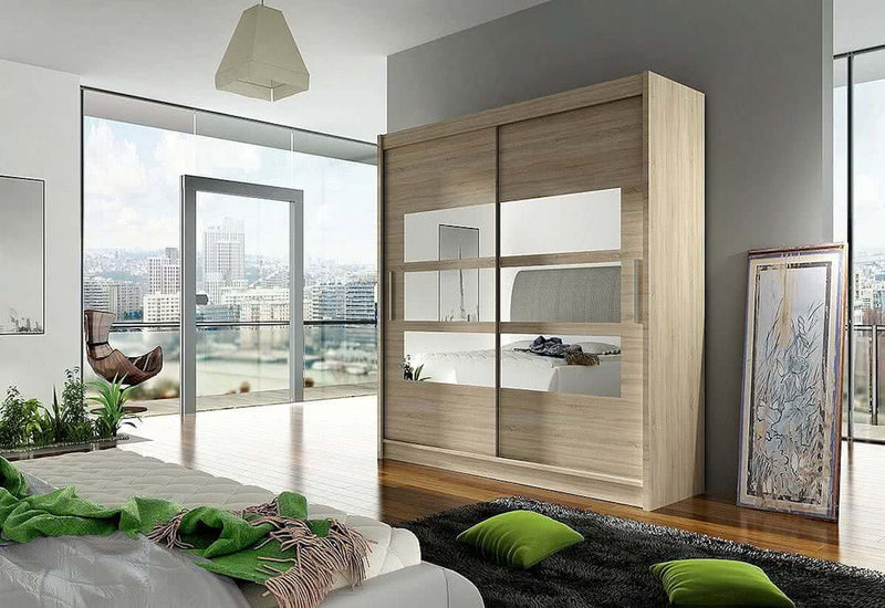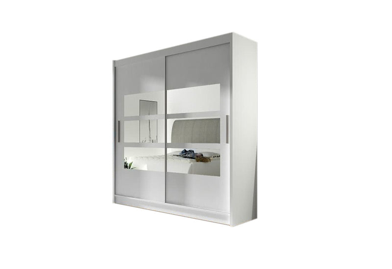 Posuvná šatníková skriňa CARLA III. Je vyrobená z kvalitného hrubého materiálu s hrúbkou 1,6 cm. Za posuvnými dverami sa nachádza priestor rozdelený na päť políc a šatníkovú tyč. Na jednoduchšie otváranie sú dvere vybavené dlhou rukoväťou. Súčasťou je aj moderné zrkadlo.
