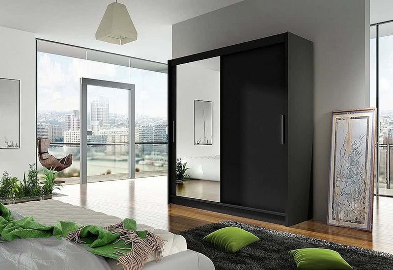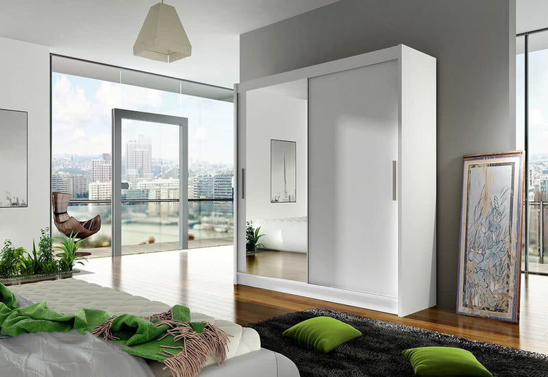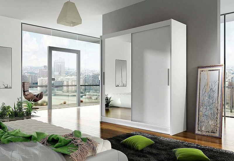 Posuvná šatníková skriňa CARLA VI. Je vyrobená z vysokokvalitného materiálu s hrúbkou 1,6 cm. Za posuvnými dverami sa nachádza priestor rozdelený medzi päť políc a šatníkovú tyč. Na jednoduchšie otváranie sú dvere vybavené dlhou rukoväťou. Súčasťou je aj veľké moderné zrkadlo na jednej strane. Môžete si vybrať z troch dekorov.