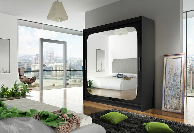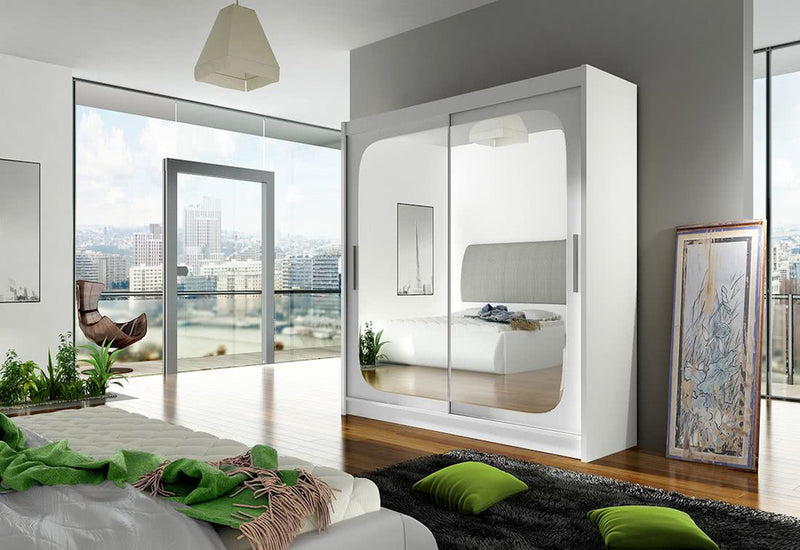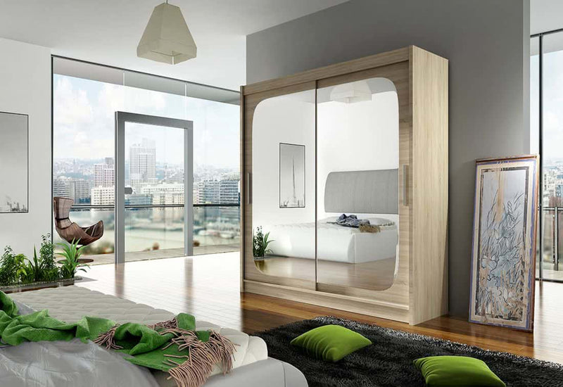 Posuvná šatníková skriňa CARLA VIII. Je vyrobená z vysokokvalitného materiálu s hrúbkou 1,6 cm. Za posuvnými dverami sa nachádza veľký úložný priestor. Poskytne vám priestranné police a šatníkovú tyč. Na jednoduchšie otváranie sú dvere vybavené dlhou rukoväťou. Súčasťou je aj veľké moderné zrkadlo, v ktorom si budete môcť prezrieť svoje každodenné oblečenie.