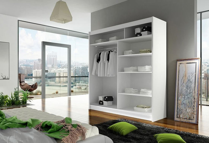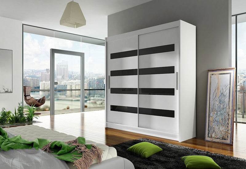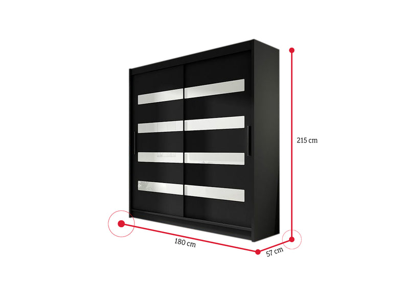 Posuvná šatníková skriňa CARLA XI. Je vyrobený z vysokokvalitného materiálu s hrúbkou 1,6 cm. Za praktickými posuvnými dverami je dostatok úložného priestoru. Poskytuje priestranné police a šatníkovú tyč. Na jednoduchšie otváranie sú dvere vybavené dlhou rukoväťou. Na výber sú dva dekory.