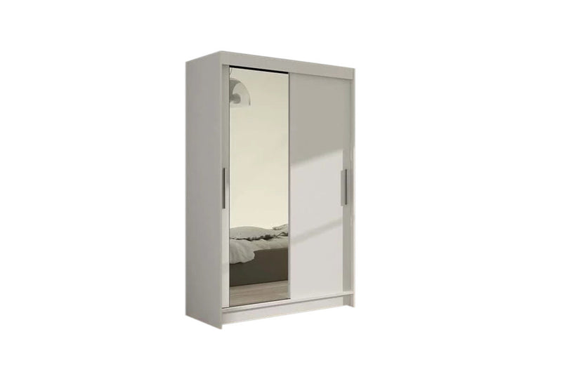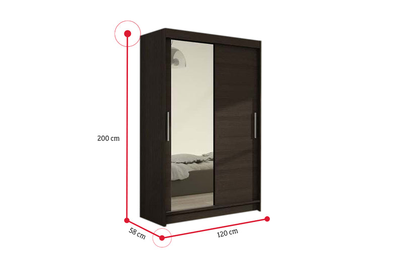 Posuvná šatníková skriňa so zrkadlom FLORIA VI. Je vyrobená z vysokokvalitného materiálu s hrúbkou 1,6 cm. Za posuvnými dverami sa nachádza veľký úložný priestor. Poskytne vám priestranné police a šatníkovú tyč. Na jednoduchšie otváranie sú dvere vybavené dlhou rukoväťou. Na jednej strane skrine je veľké zrkadlo. Výber z niekoľkých dekorov.