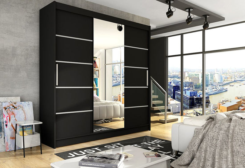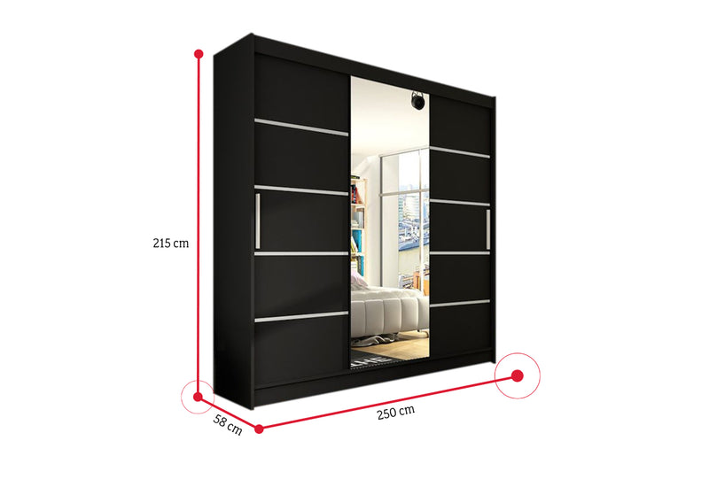 Posuvná trojdverová šatníková skriňa LUKAS VI so zrkadlom. Je vyrobená z vysokokvalitného materiálu. Za posuvnými dverami sa nachádza veľký úložný priestor. Poskytne vám priestranné police a šatníkovú tyč. Na jednoduchšie otváranie sú dvere vybavené dlhou rukoväťou. Stačí si vybrať farbu a nechať šatník zapadnúť do vášho interiéru.