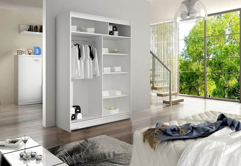 Posuvná šatníková skriňa so zrkadlom STAWEN V. Je vyrobená z vysokokvalitného materiálu s hrúbkou 1,6 cm. Za posuvnými dverami sa nachádza veľký úložný priestor. Poskytne vám priestranné police a šatníkovú tyč. Na jednoduchšie otváranie sú dvere vybavené dlhou rukoväťou. Jej súčasťou je aj zaujímavo riešené zrkadlo. Na výber máte z niekoľkých dekorov.