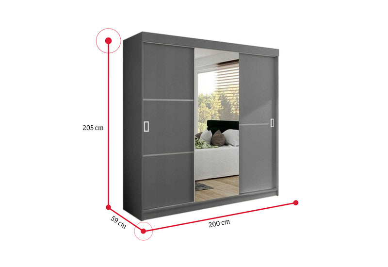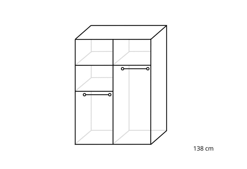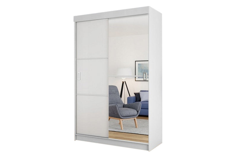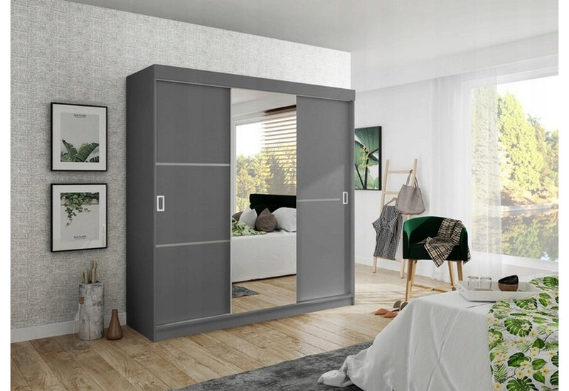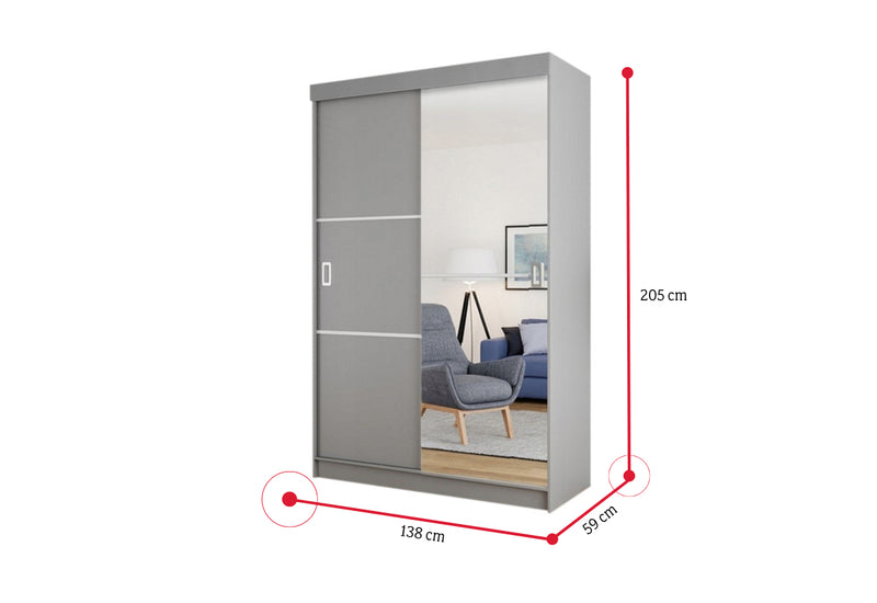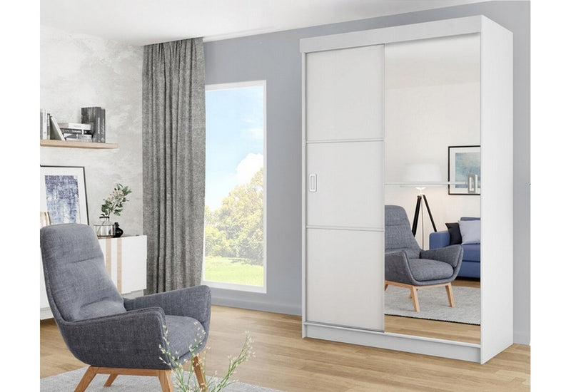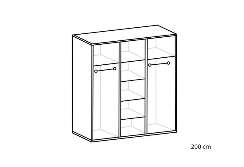 Posuvná skriňa LUKE 2. Je vyrobená z vysokokvalitného materiálu s hrúbkou 1,6 cm. Skriňa obsahuje posuvné dvere so zrkadlom. Vnútorný priestor skrine pozostáva zo šatníkovej tyče a políc. Môžete si vybrať z dvoch šírok a dvoch dekorov.