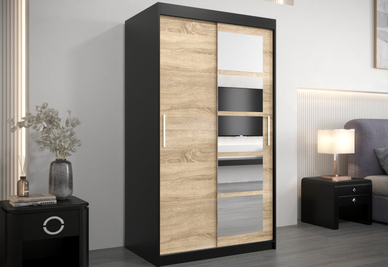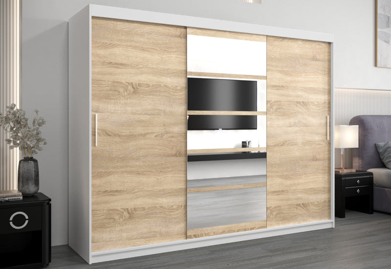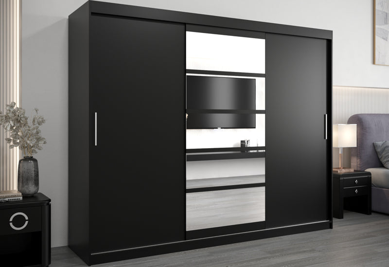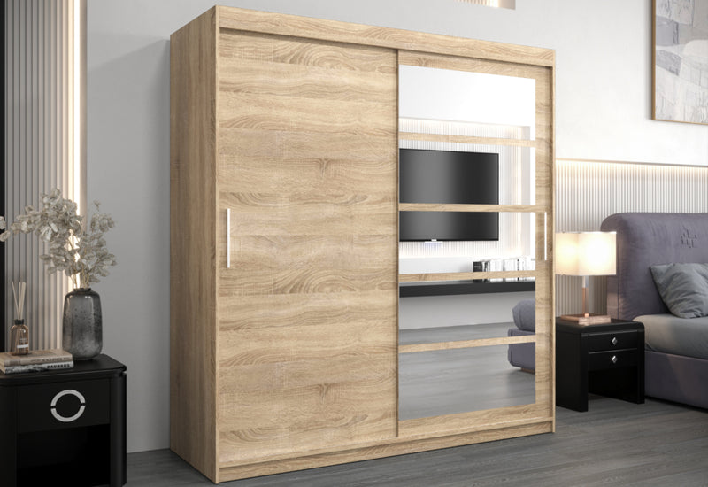 Posuvná skriňa SALVINI 1. Je vyrobená z vysokokvalitného materiálu s hrúbkou 1,6 cm. Šatníková skriňa je vnútorne rozdelená na niekoľko políc, šatníkové tyče sú súčasťou dodávky. Počet políc závisí od šírky skrine. Posuvné dvere s úzkymi úchytkami a zrkadlom na jednej strane dokonale dopĺňajú dizajn skrine. K dispozícii v niekoľkých farbách a veľkostiach.