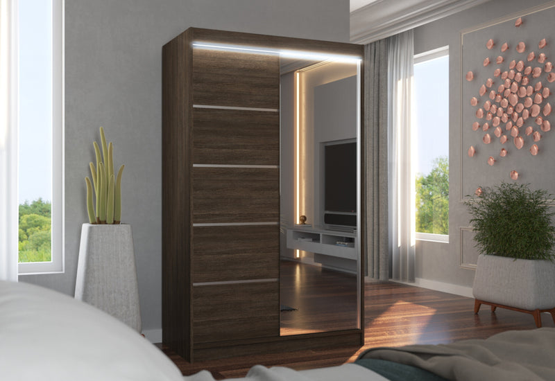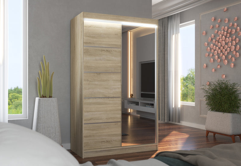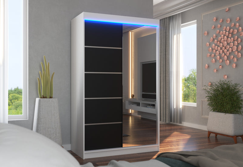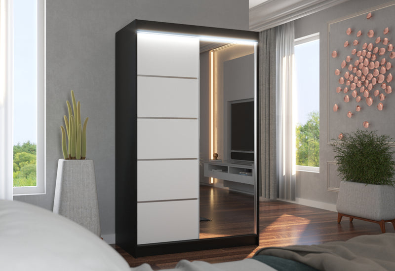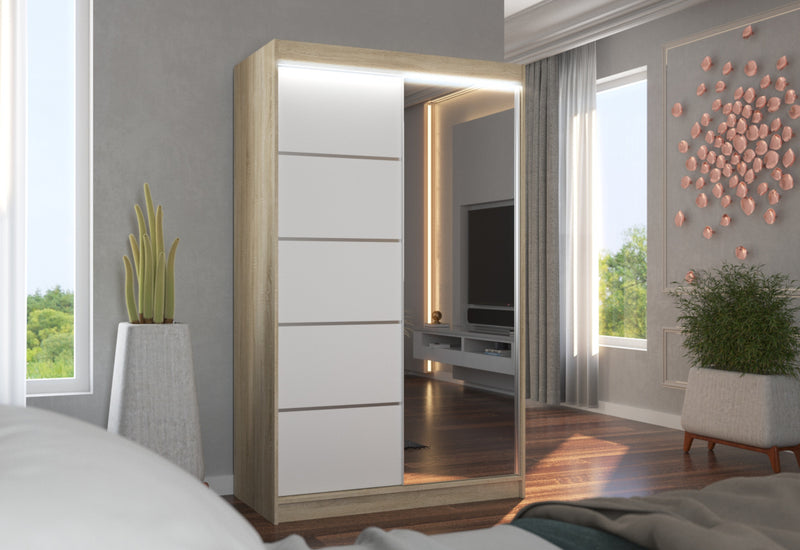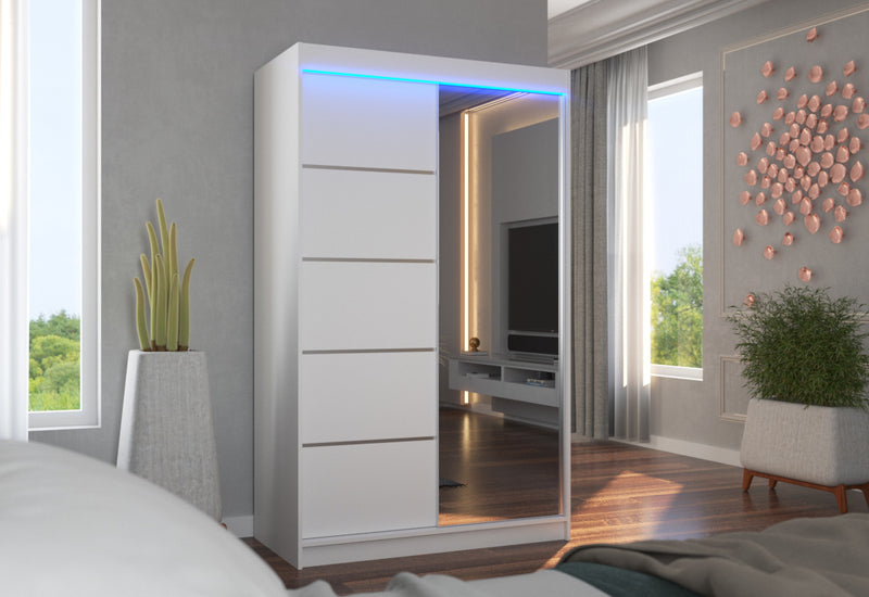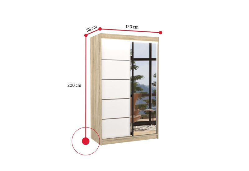 Posuvná skriňa so zrkadlom ANCORA. Je vyrobená z vysokokvalitného materiálu s hrúbkou 1,6 cm. Šatníková skriňa ponúka dostatok úložného priestoru v podobnom voľnom priestore so šatníkovou tyčou a piatimi policami. Vnútorná časť šatníka je zakrytá posuvnými dverami so zrkadlom. Šatníková skriňa je k dispozícii vo viacerých farebných prevedeniach. Možnosť s osvetlením LED.