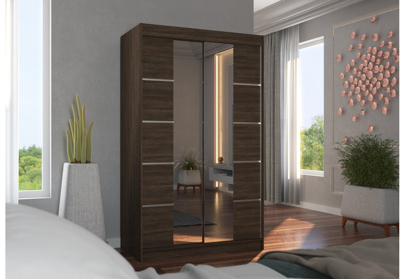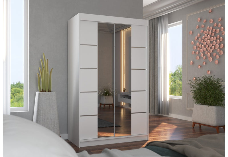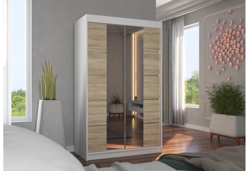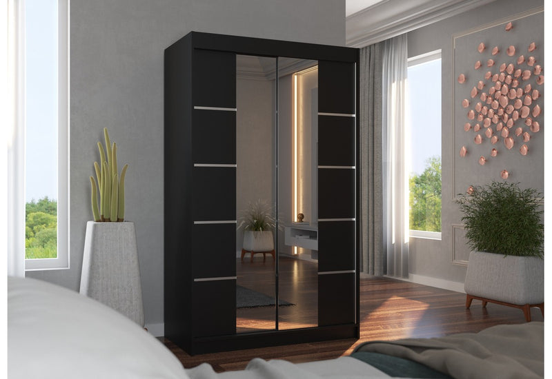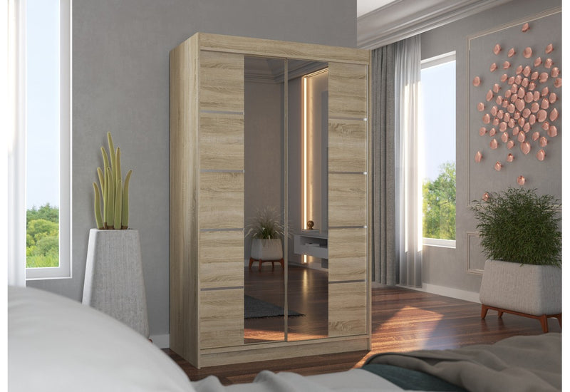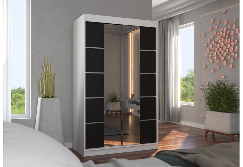 Posuvná skriňa so zrkadlom LAGUNA. Je vyrobený z vysokokvalitného materiálu s hrúbkou 1,6 cm. Tým sa materiál chráni pred mechanickým poškodením a vlhkosťou. Šatníková skriňa ponúka dostatok úložného priestoru v podobnom voľnom priestore so šatníkovou tyčou a piatimi policami. Vnútorná časť skrine je zakrytá posuvnými dverami so zrkadlom. Šatníková skriňa je k dispozícii vo viacerých farebných prevedeniach. Možnosť s osvetlením LED.