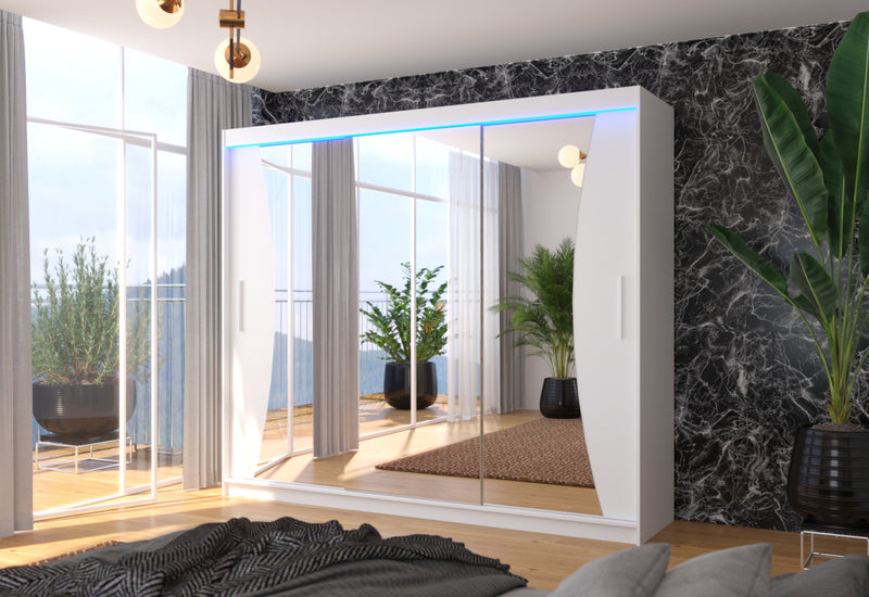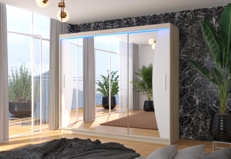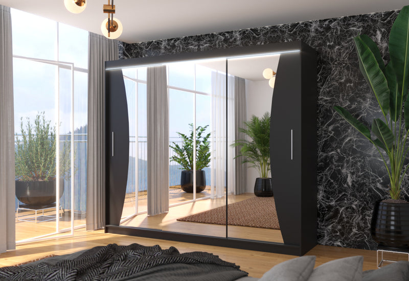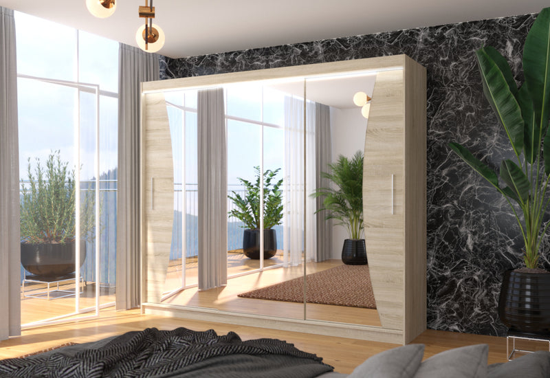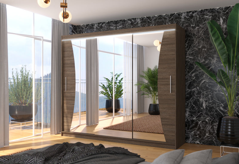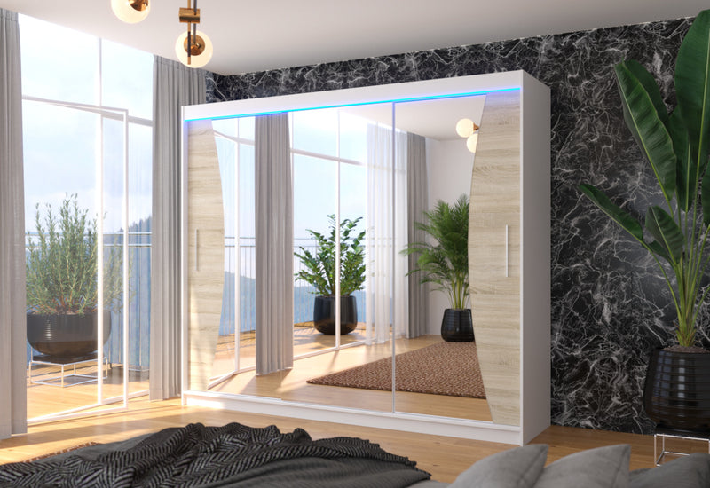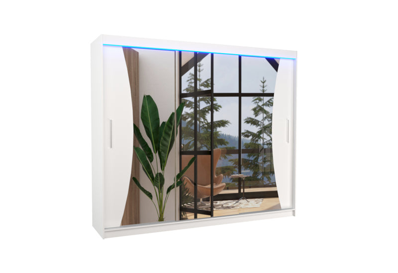 Posuvná skriňa so zrkadlom MARADONA. Na výrobu skrine bol použitý vysokokvalitný materiál s hrúbkou 1,6 cm s ochrannými hranami ABS. Šatníková skriňa ponúka úložný priestor v podobe 9 políc a šatníkovej tyče. Nachádza sa v centrálnej časti. Praktické a elegantné rukoväte zabezpečujú jednoduché otváranie. Dominantou je veľké zrkadlo. Môžete si vybrať z niekoľkých dekorov s možnosťou osvetlenia LED.