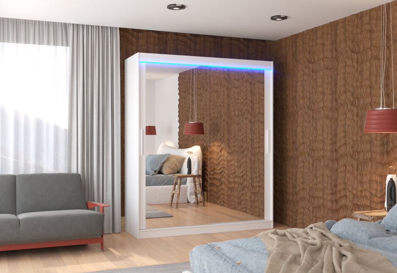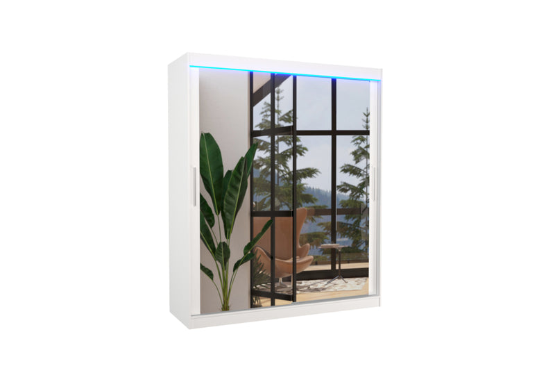 Posuvná skriňa so zrkadlom RAPID. Je vyrobená z vysokokvalitného materiálu s hrúbkou 1,6 cm. Šatníková skriňa ponúka dostatok úložného priestoru v podobnom voľnom priestore so šatníkovou tyčou a piatimi policami. Vnútorná časť šatníka je zakrytá posuvnými dverami so zrkadlom. Šatníková skriňa je k dispozícii vo viacerých farebných prevedeniach. Možnosť s osvetlením LED.