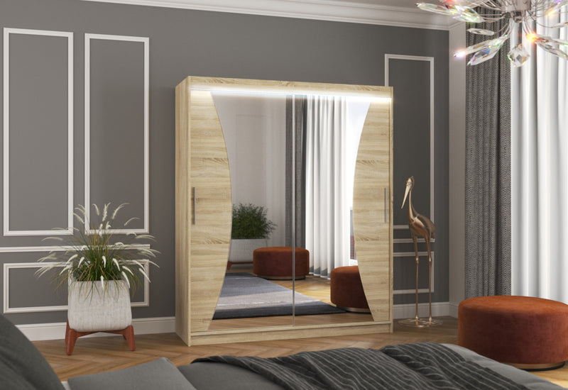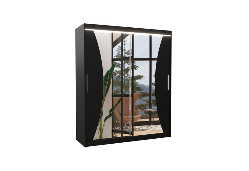 Posuvná skriňa so zrkadlom SWIFT. Je vyrobená z vysokokvalitného materiálu s hrúbkou 1,6 cm. Šatníková skriňa ponúka dostatok úložného priestoru. Vnútorná časť šatníka je zakrytá posuvnými dverami so zrkadlom. Šatníková skriňa je k dispozícii vo viacerých farebných prevedeniach. Možnosť s LED osvetlením.