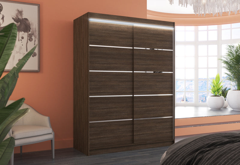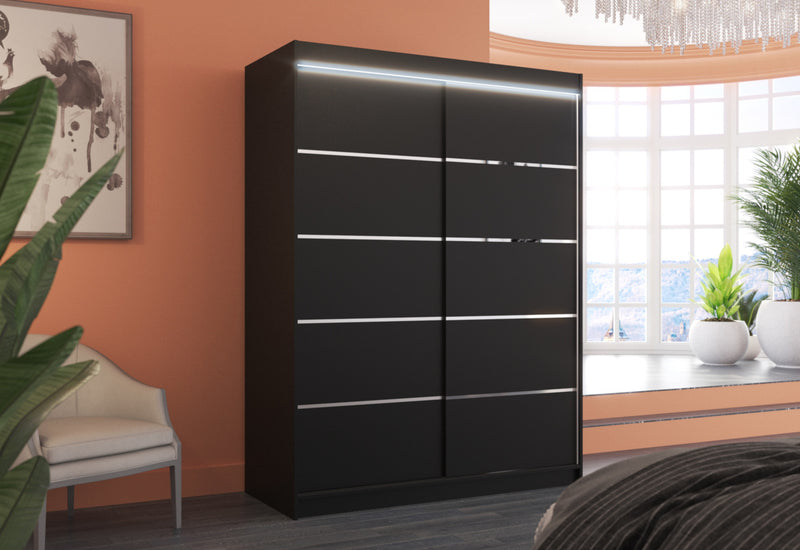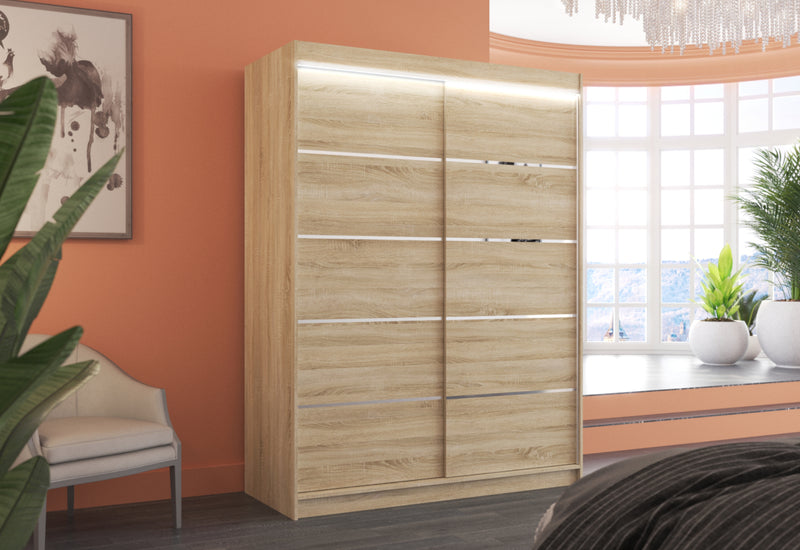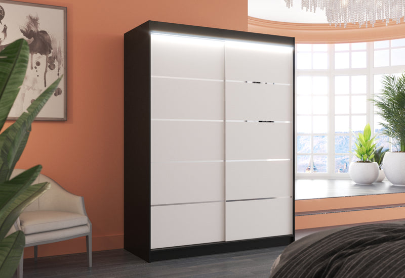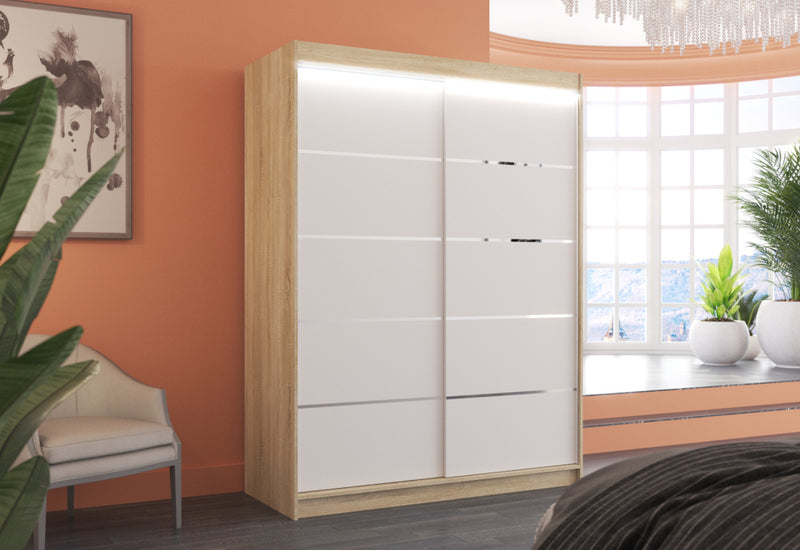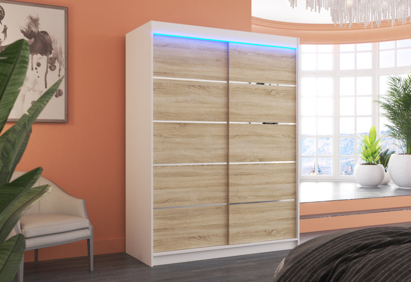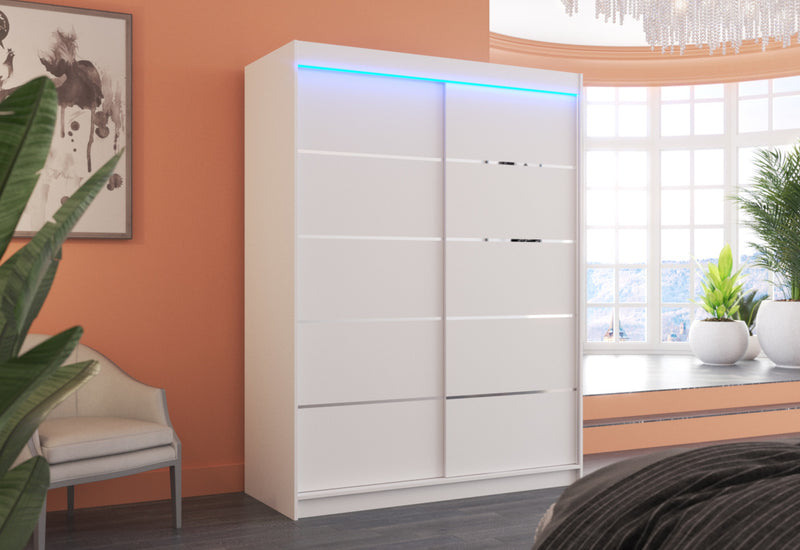 Posuvná skriňa SURF. Je vyrobená z vysokokvalitného materiálu s hrúbkou 1,6 cm. Šatníková skriňa je vo vnútri rozdelená na niekoľko políc, súčasťou je aj šatníková tyč. Posuvné dvere bez úchytiek dokonale dopĺňajú dizajn skrine. K dispozícii vo viacerých farbách. Možnosť s osvetlením LED.