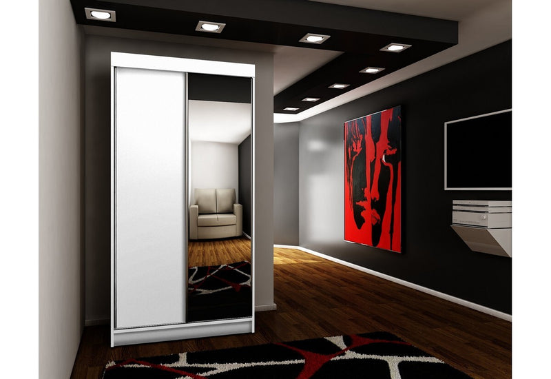 Posuvná skriňa TALIA 33 je vyrobená z vysokokvalitného materiálu s hrúbkou 1,6 cm. Skriňa obsahuje posuvné dvere so zrkadlom doplnené dvoma pásmi čierneho skla. Vnútorný priestor skrine pozostáva zo šatníkovej tyče a políc. Môžete si vybrať zo štyroch možností šírky. Je k dispozícii v troch rôznych dekoroch.