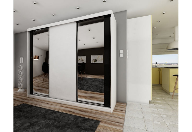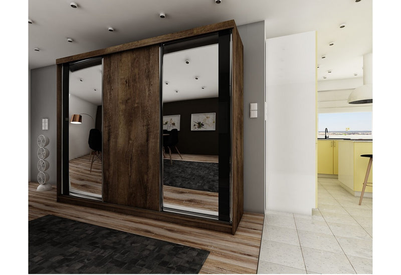 Posuvná skriňa TALIA 35 je vyrobený z vysokokvalitného materiálu s hrúbkou 1,6 cm. Skriňa obsahuje tri posuvné dvere. Dve z nich sú vybavené zrkadlom a pásom čierneho skla. Vnútorný priestor skrine pozostáva zo šatníkovej tyče a políc. Je k dispozícii v troch dekoroch.