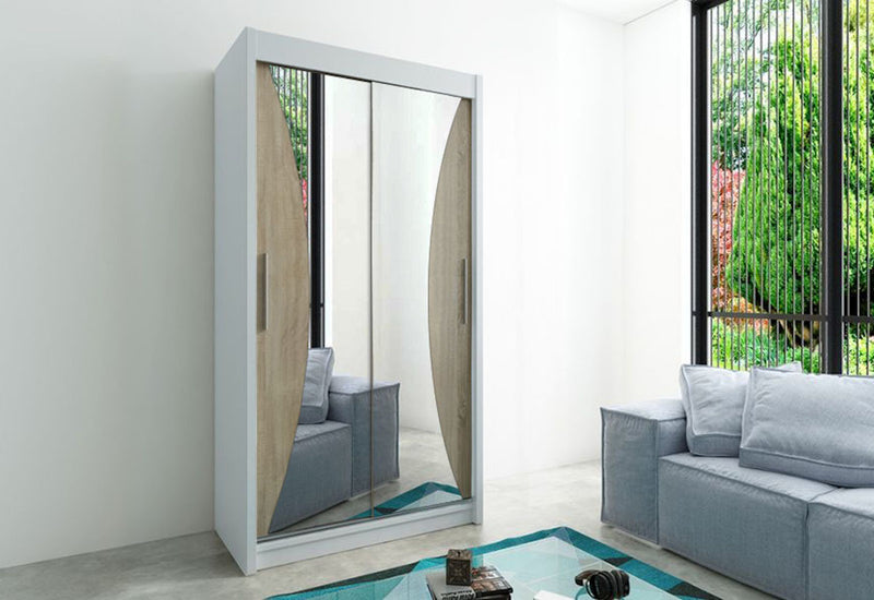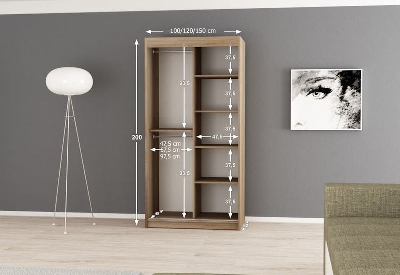 Posuvná skriňa TELE. Je vyrobený z vysokokvalitného materiálu s hrúbkou 1,6 cm. Šatníková skriňa je vnútorne rozdelená na niekoľko políc, šatníkové tyče sú súčasťou dodávky. Posuvné dvere s tvarovaným zrkadlom a úzkymi úchytkami dokonale dopĺňajú dizajn skrine. K dispozícii v niekoľkých farbách a veľkostiach.