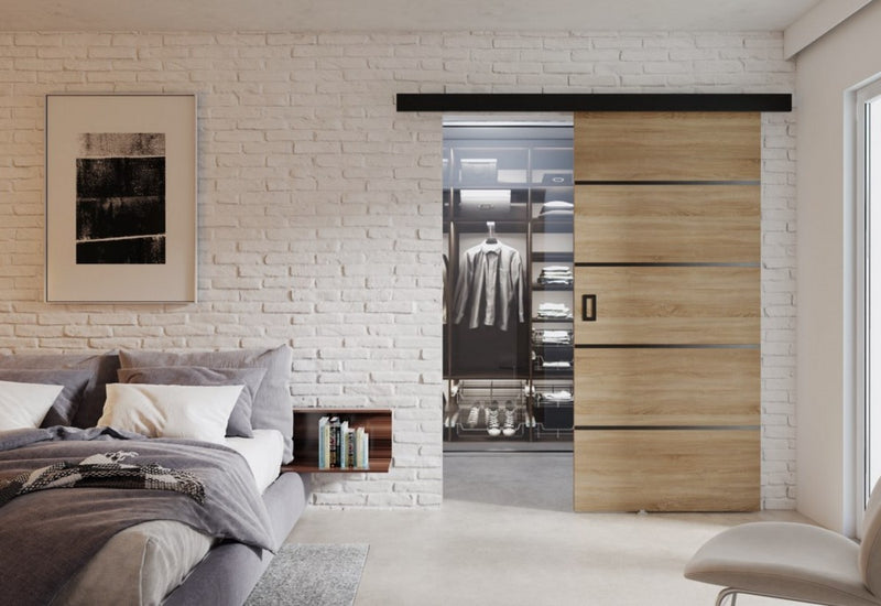 Posuvné dvere AIDA PLUS. Sú vyrobené z prvotriedneho materiálu. Jednoduchšie otváranie zaistí obdĺžnikový úchyt v čiernej farbe. Moderný vzhľad dopĺňajú dekoratívne pruhy široké 1,6 cm. Pojazdový systém je samozrejme súčasťou balenia. Vybrať si môžete z troch šírkových parametrov a tiež zo štyroch nádherných dekorov. Veľkou výhodou je možnosť dokúpenia systému tichého zatvárania.
