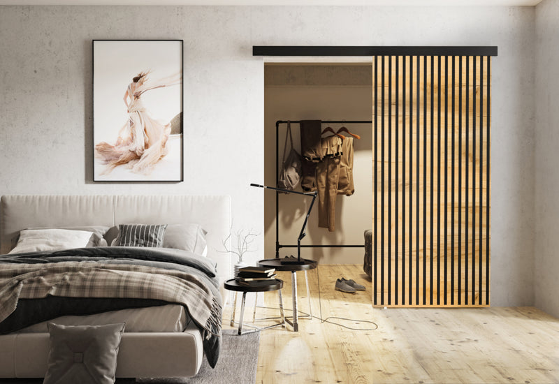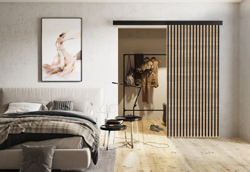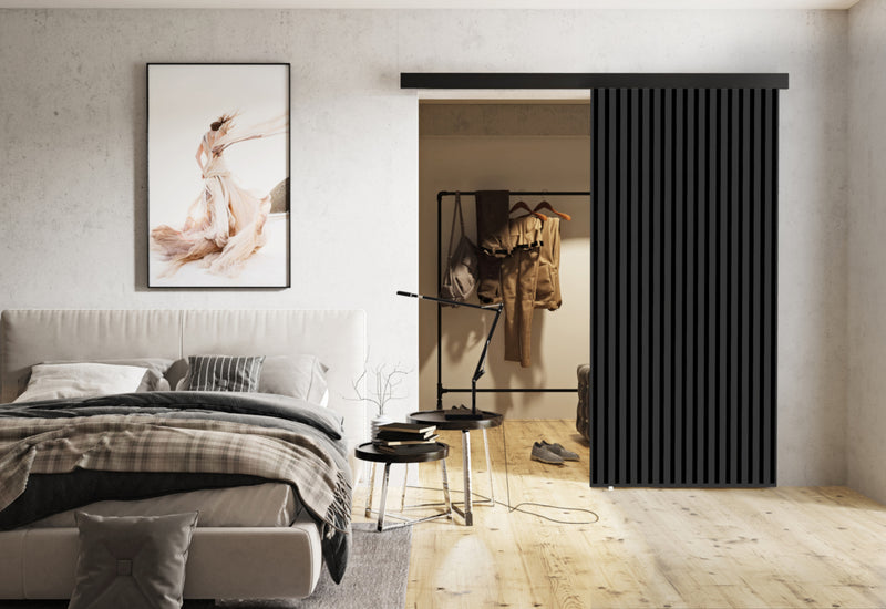 Posuvné dvere BELMA. Posuvné dvere sú vyrobené z kvalitného materiálu s hrúbkou 1,6 cm. Materiál je opatrený ABS hranou, ktorá chráni pred poškodením. Hliníkový pojazdový systém zakrýva krycia lišta, ktorá je súčasťou balenia. Môžete ich využiť ako klasický vchod do ďalšej miestnosti alebo do špeciálne vytvorenej šatne. Dvere sú bezúchytové a ľahké otváranie zaistí lamelové prvky. Možnosť voľby z viacerých dekorov a rozmerov.