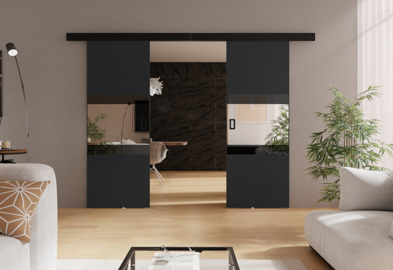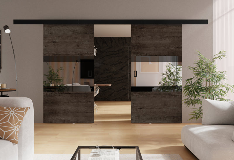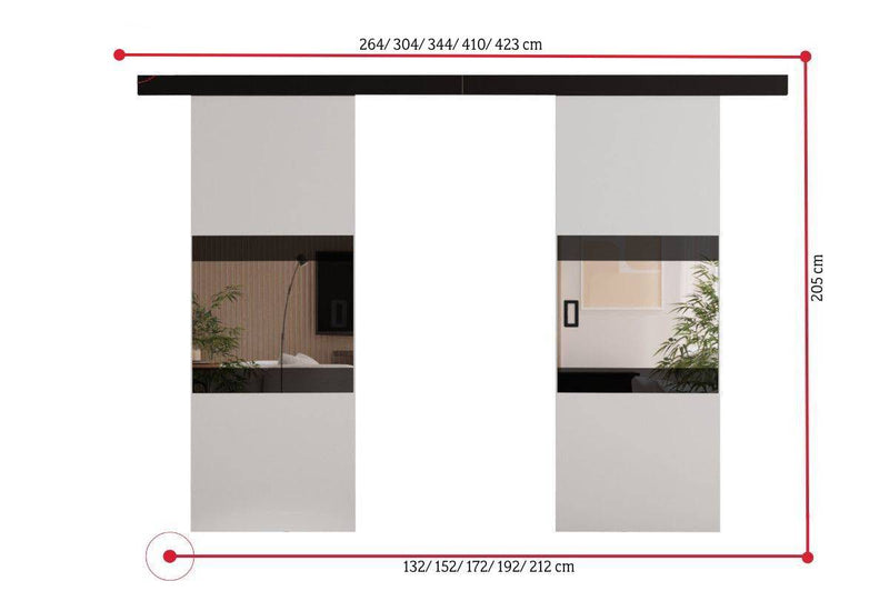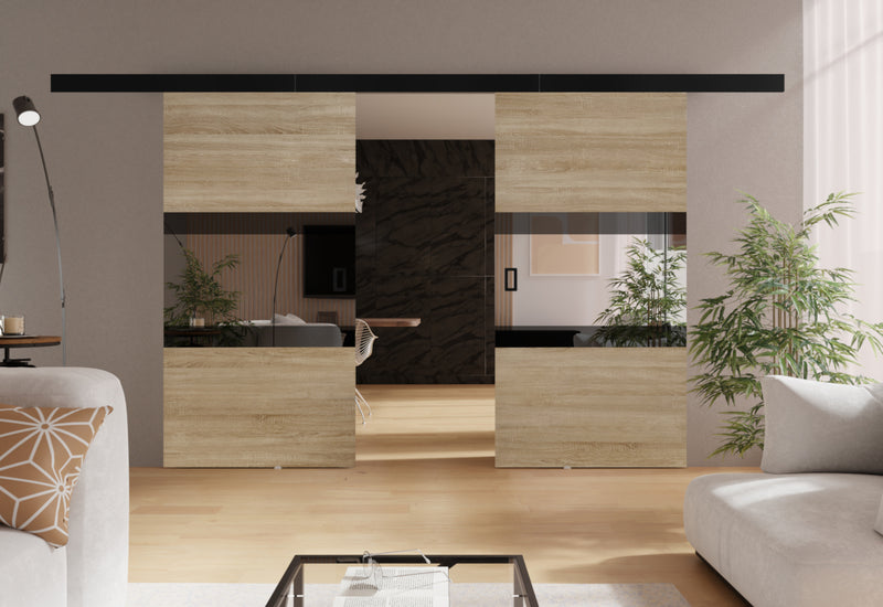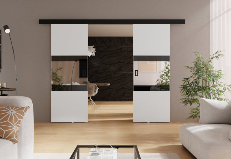 Posuvné dvere KALENA 2. Posuvné dvere sú vyrobené z kvalitného materiálu o hrúbke 16 mm. Materiál je opatrený ABS hranou, ktorá chání pred poškodením. Hliníkový pojazdový systém zakrýva krycia lišta, ktorá je súčasťou balenia. Môžete ich využiť ako klasický vchod do ďalšej miestnosti, alebo do špeciálne vytvorenej šatne. Súčasťou dverí je zrkadlo. Možnosť voľby z viacerých dekorov. Možnosť voľby rozmeru.