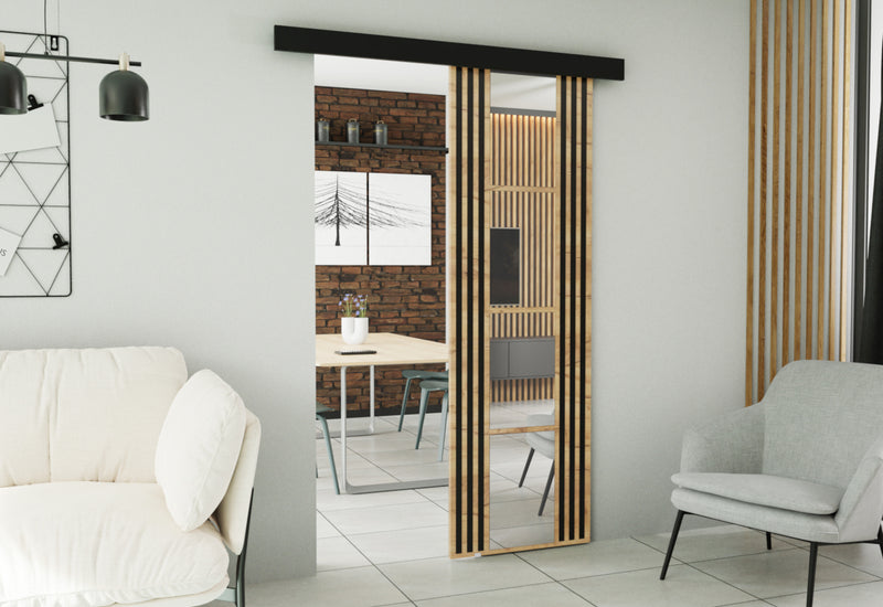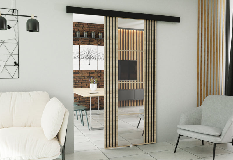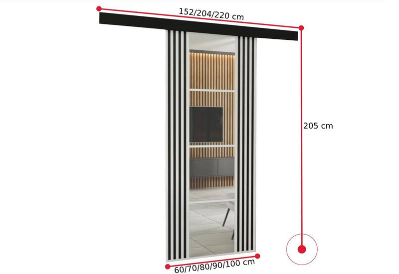 Posuvné dvere LAKI. Posuvné dvere sú vyrobené z kvalitného materiálu o sile 1,6 cm. Materiál je opatrený ABS hranou, ktorá cháňí pred poškodením. Hliníkový pojazdový systém zakrýva krycia lišta, ktorá je súčasťou balenia. Môžete ich využiť ako klasický vchod do ďalšej miestnosti, alebo do špeciálne vytvorenej šatne. Súčasťou dverí je zrkadlo. Možnosť voľby z viacerých dekorov a rozmerov.