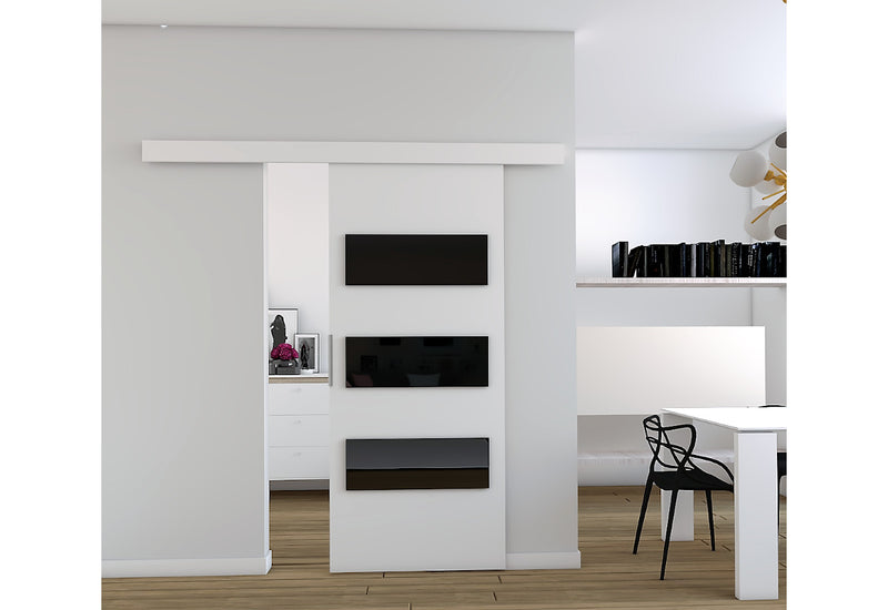 Posuvné dvere LIVELLO IV. Môžete ich využiť ako klasický vchod do ďalšej miestnosti, alebo do špeciálne vytvorenej šatne. Sú vyrobené z materiálu v šírke 1,6 cm. Ľahké otváranie zaistí dlhá hliníková rukoväť. Dvere zdobia lepené dekoratívne prvky z čierneho skla. Systém pojazdu, ložísk a inštalačný materiál je pochopiteľne súčasťou. Vybrať si môžete z niekoľkých atraktívnych dekorov. Samostatné dvere majú rozmery 205x86 cm. Celková výška je 213 cm. Otvor dverí 204x80 cm.