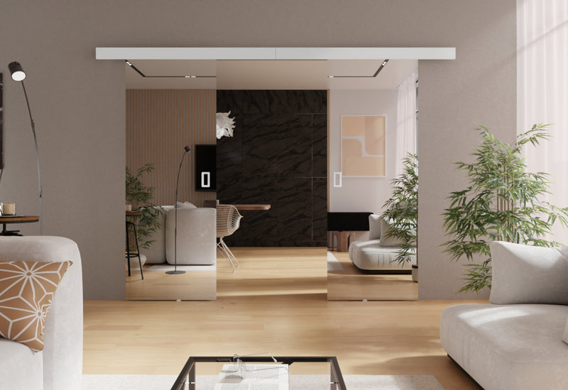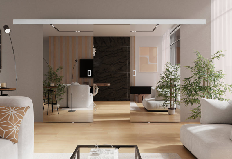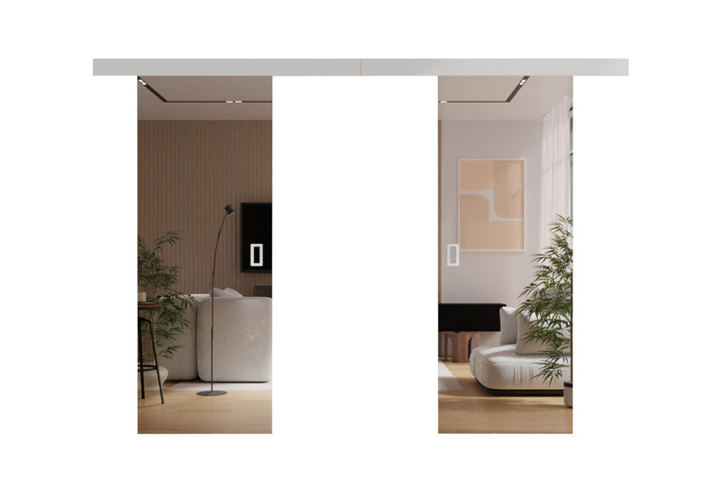 Posuvné dvere MURAN. Posuvné dvere sú vyrobené z kvalitného materiálu o hrúbke 16 mm. Materiál je opatrený ABS hranou, ktorá chánia pred poškodením. Hliníkový pojazdový systém zakrýva krycia lišta, ktorá je súčasťou balenia. Celú plochu dverí zakrýva zrkadlo. Môžete ich využiť ako klasický vchod do ďalšej miestnosti, alebo do špeciálne vytvorenej šatne. Možnosť voľby z viacerých rozmerov.