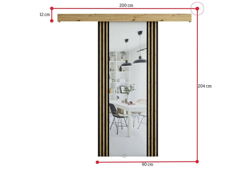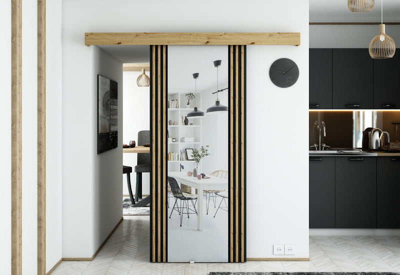 Posuvné dvere RODEN 2. Môžete ich využiť ako klasický vchod do ďalšej miestnosti, šatne alebo ako doplnok do predsiene. Sú vyrobené z materiálu hrúbky 1,6 cm s ABS hranou. Dvere sú bezúchytové a ľahké otváranie zaistia lamelové prvky. Súčasťou je zrkadlo v celej výške. Samolepiace ozdobné prúžky v čiernej farbe obdržíte spoločne s dverami. Vďaka modernému dizajnu je ich možné zladiť so zvyškom interiéru.