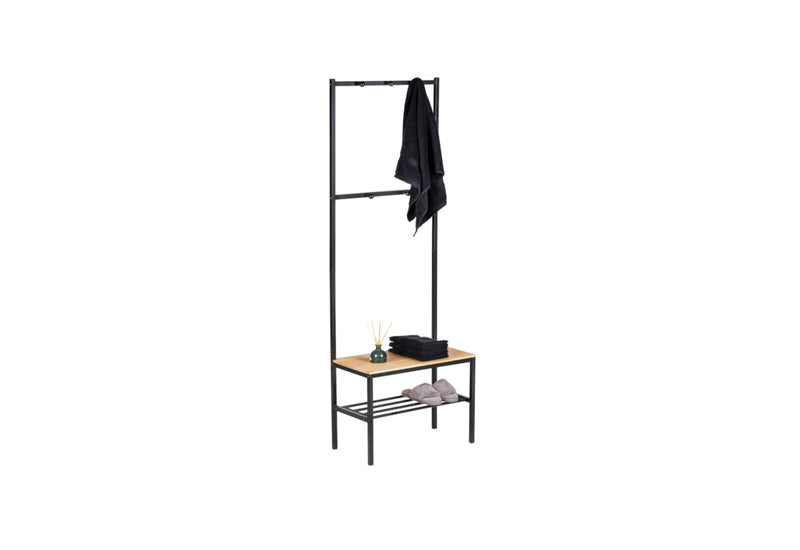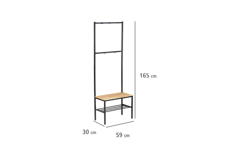 Predsieňová stena ODETE. Jednoduché rovné línie v industriálnom štýle. Poskytne dostatok odkladacieho priestoru. Vyrobená je z prírodného borovicového dreva v kombinácii kovovej konštrukcie v čiernej farbe. Botník disponuje sedacou plochou a spodnou poličkou na odkladanie obuvi. Súčasťou je päť háčikov na odloženie búnd, kabátov, tašiek alebo šatiek. Odporúčame kombinovať s ďalšími produktmi z radu ODETE.