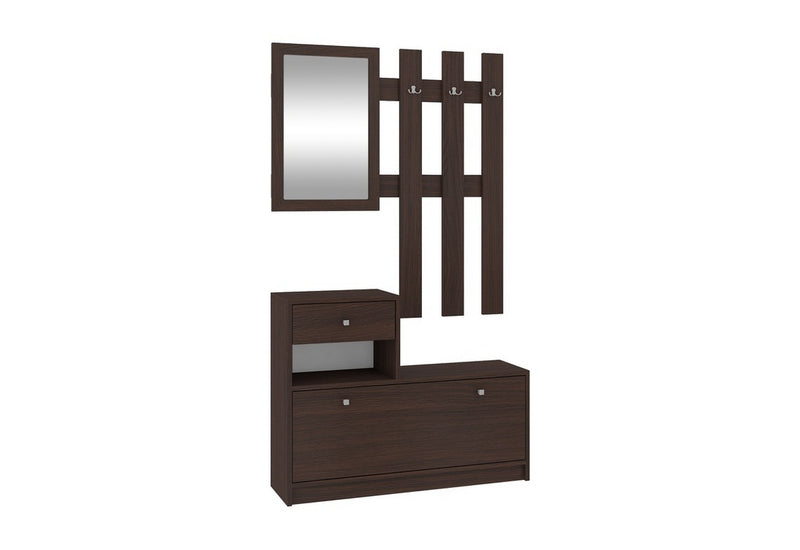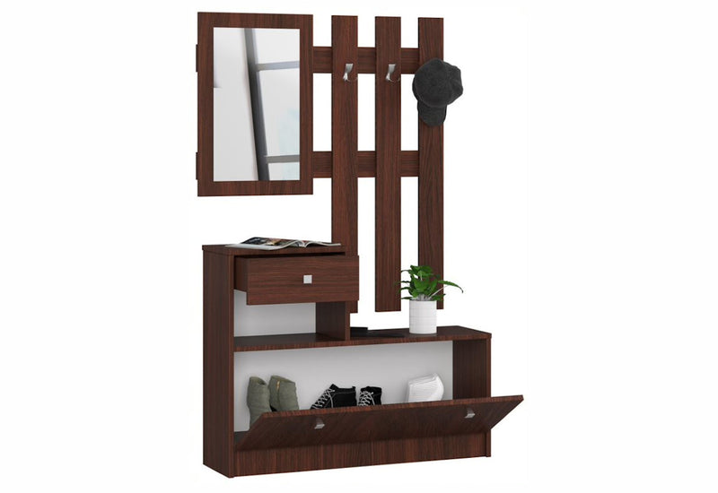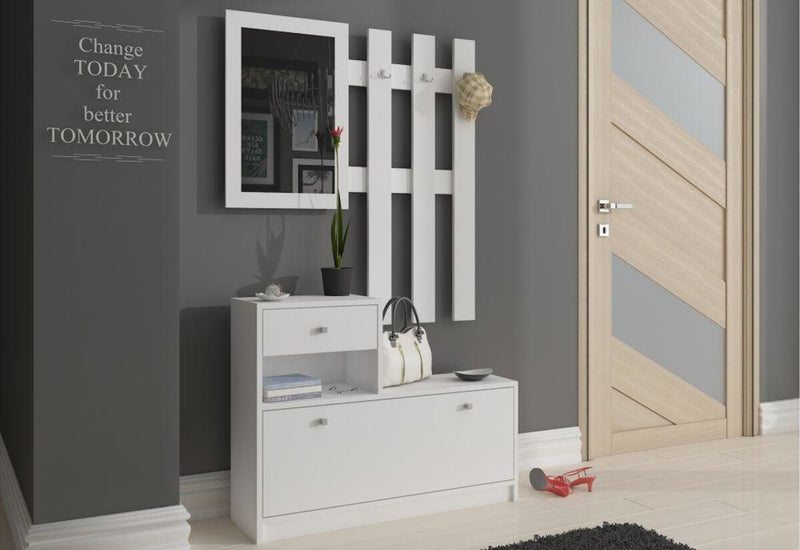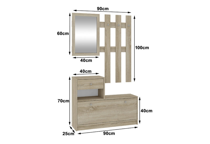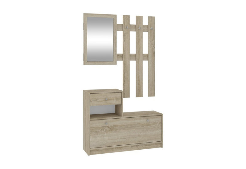 Predsieňová zostava BETH je vyrobená z kvalitného lamina, ktoré pred poškodením chráni hrana ABS. Skladá sa z dvoch častí. Súčasťou prvej je botník s dvierkami a malá zásuvka. Dvierka aj zásuvka sú opatrené úchyty pre lepšiu manipuláciu. Druhá časť je zložená z troch rozdvojených vešiakov a zrkadlom.