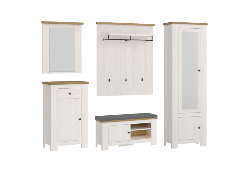 Predsieňová zostava CELESTAN. Zaujme moderným dizajnom a kvalitným spracovaním. Je vyrobená z kvalitného materiálu . Zostava ponúka množstvo úložného priestoru. Skladá sa zo skrine so zrkadlom, komody, botníku, nástenného vešiaka a zrkadla. Všetko je opatrené kovovými úchytmi pre ľahšie otváranie.